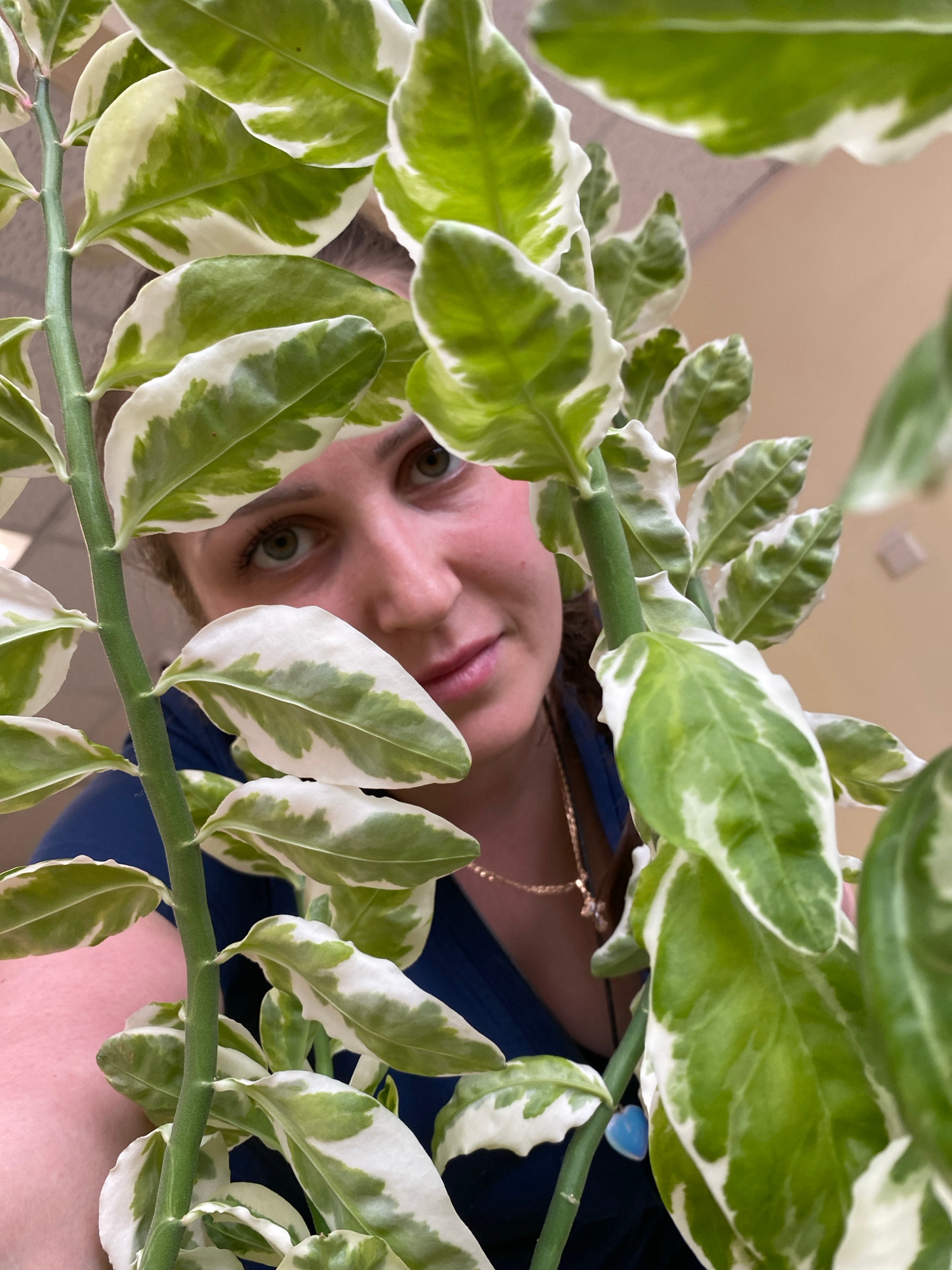The image shows a woman looking up at the camera through a plant with green and white variegated leaves. The woman has fair skin, green eyes, and is wearing a blue top and a gold necklace. The plant i…read more
