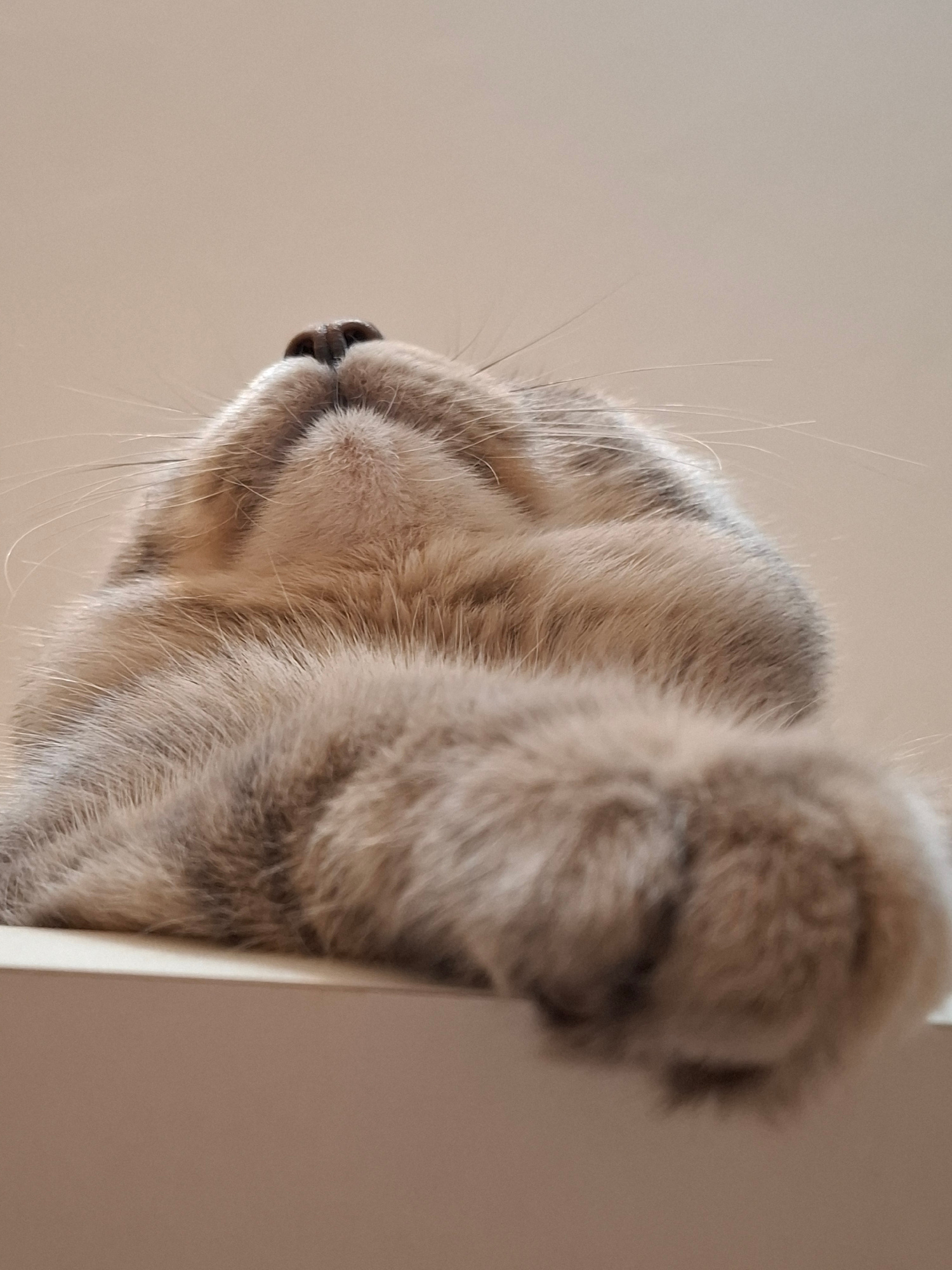A close-up, side-view image shows the head of a light brown and gray tabby cat with its eyes closed. The cat's nose and whiskers are visible on the left side of the frame. The cat's head and paw are p…read more