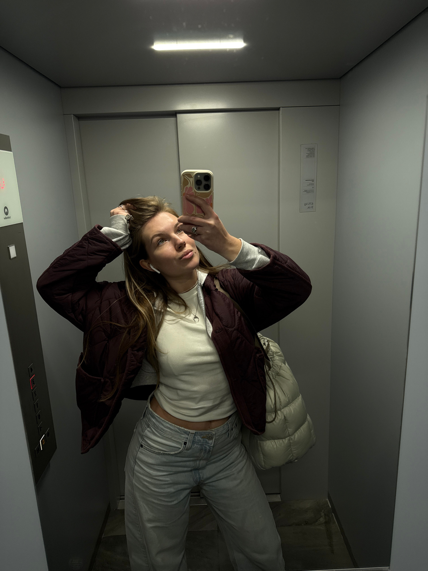 A young woman is taking a selfie in an elevator. She is wearing a white long-sleeved shirt, a burgundy quilted jacket, and light-wash jeans. She is holding a smartphone in her right hand, and her left…read more