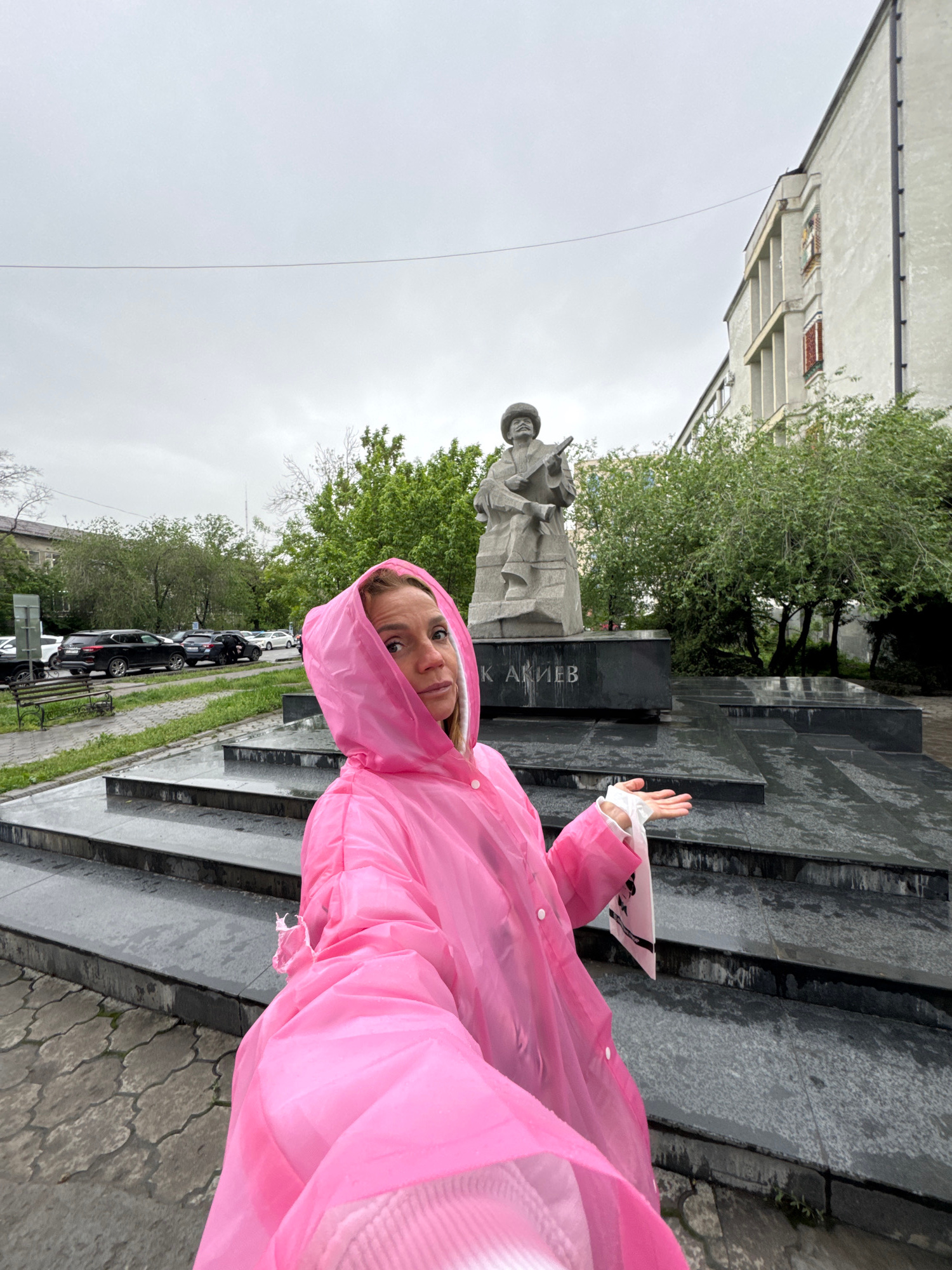 A young woman wearing a bright pink hooded raincoat stands outdoors, looking directly at the camera with a slight smile. Her left hand is raised, holding a small white object. She is positioned next t…read more