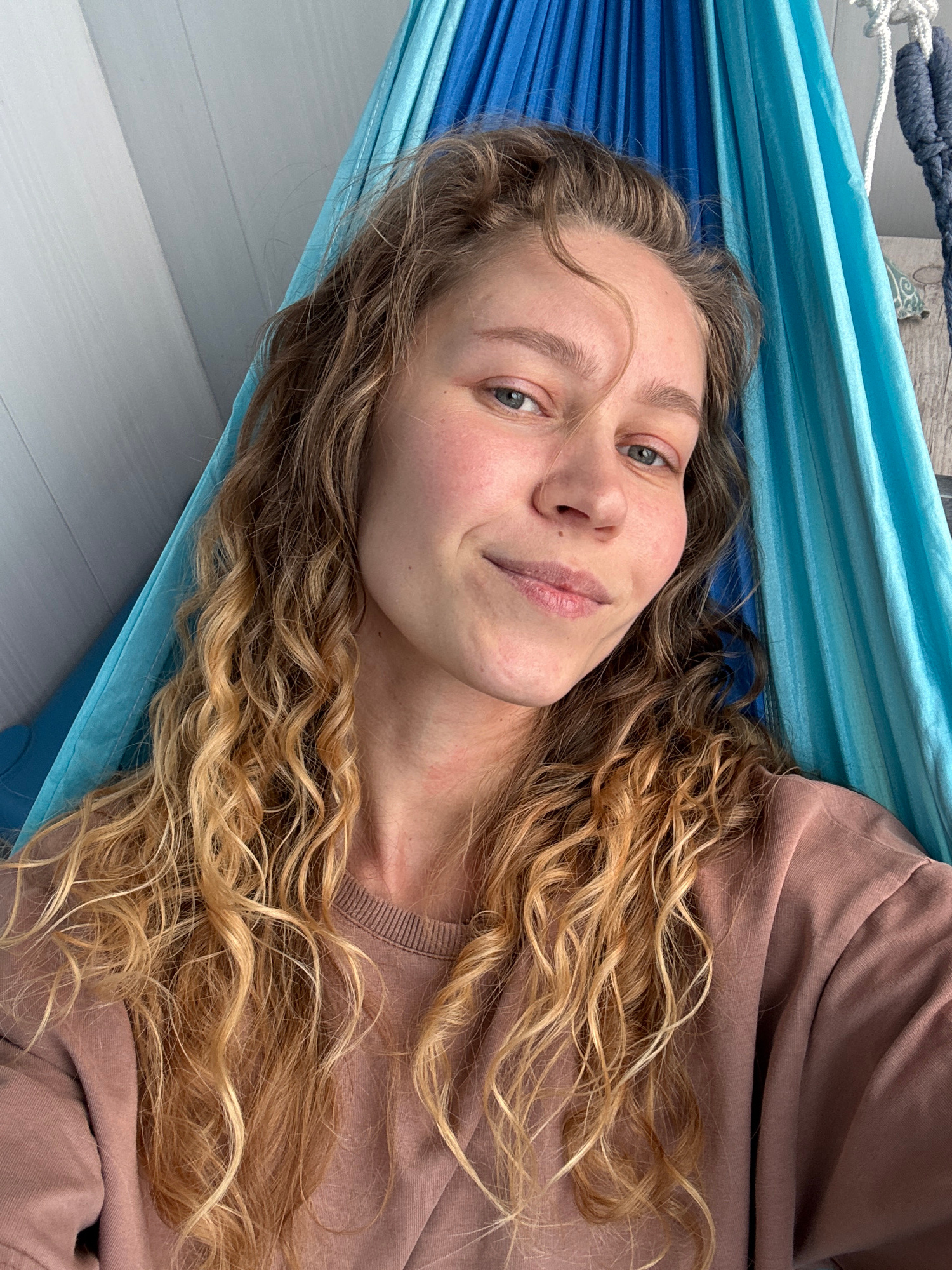 A woman with long, curly blonde hair is lying in a blue hammock. She is wearing a brown sweatshirt. The hammock is suspended near a light-colored wooden wall or surface. The location is unknown; there…read more