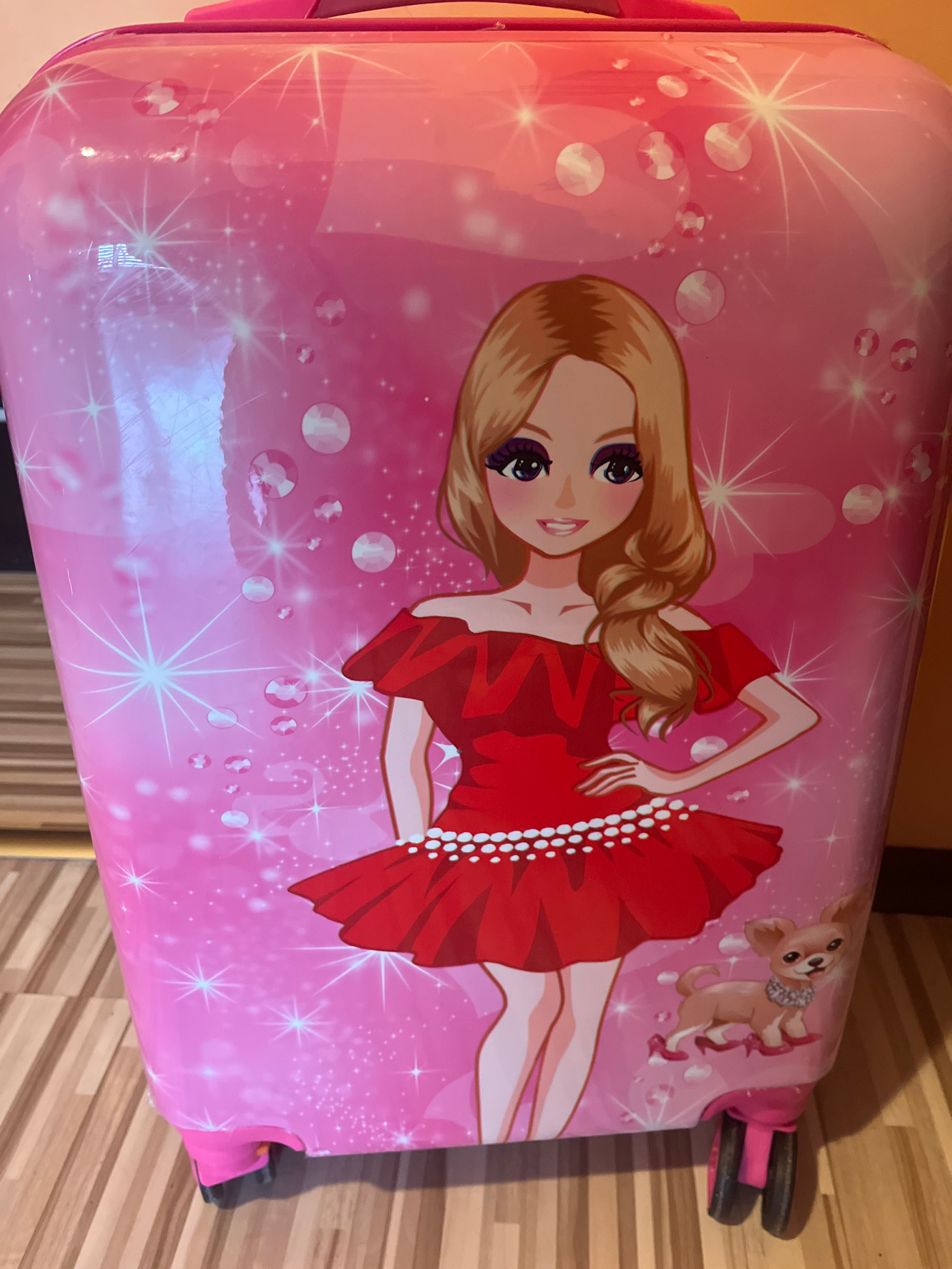 The image shows a pink, hard-sided suitcase decorated with a cartoon image of a blonde woman in a red dress and a small dog. The suitcase has a handle on one side and wheels at the opposite end. The b…read more