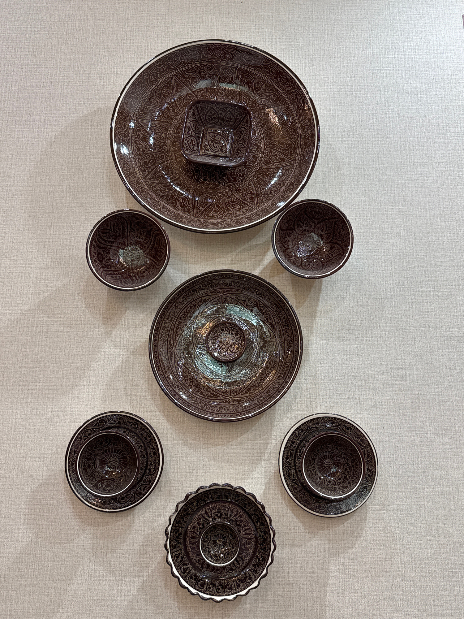 The image shows a collection of seven brown ceramic dishes with intricate patterns displayed on a light beige textured wall. The arrangement includes a large bowl with a square centerpiece, a medium-s…read more