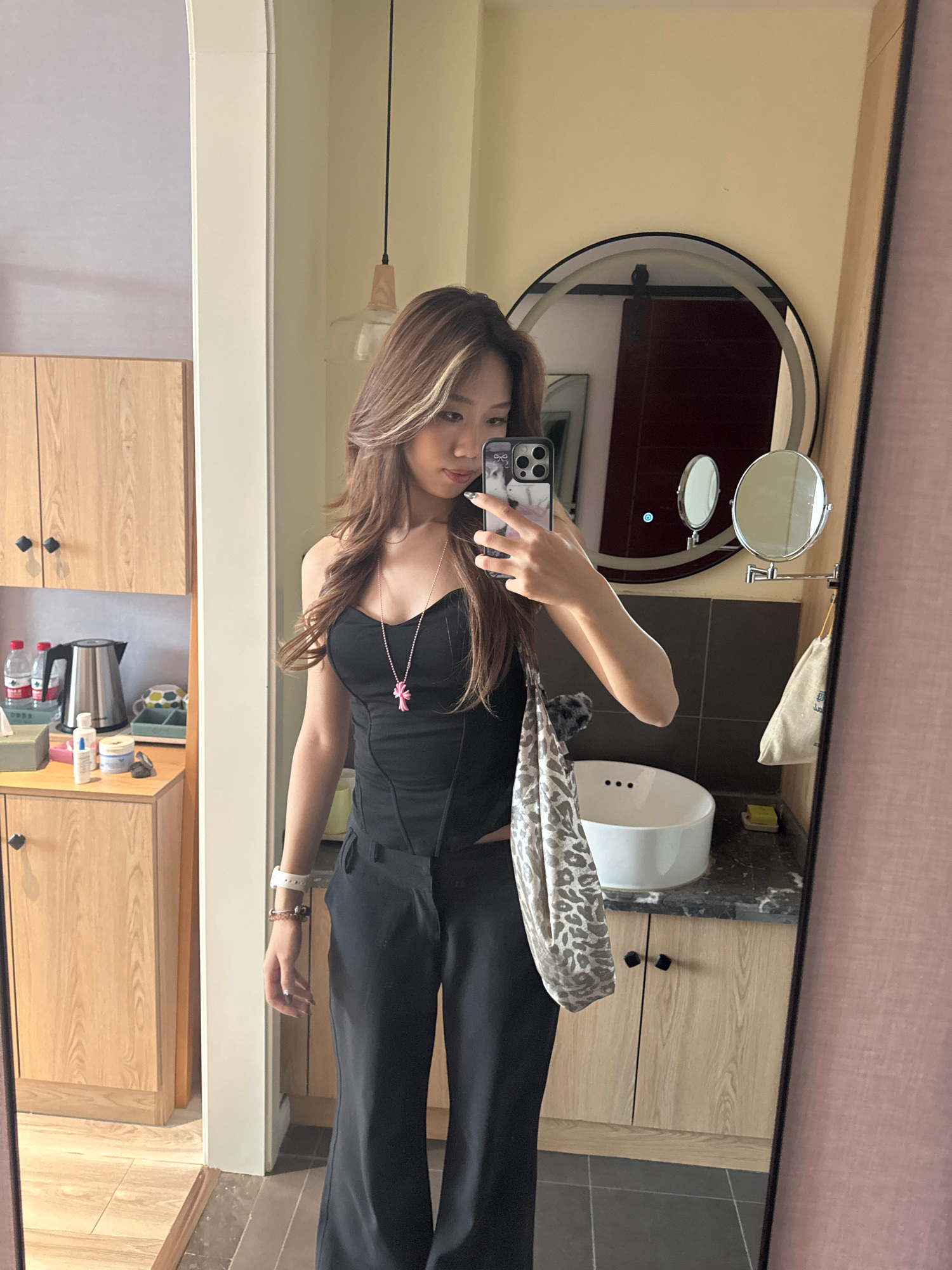 A young woman is captured taking a mirror selfie indoors. She has long, layered brown hair with lighter blonde highlights framing her face. She wears a black, form-fitting sleeveless top, black trouse…read more