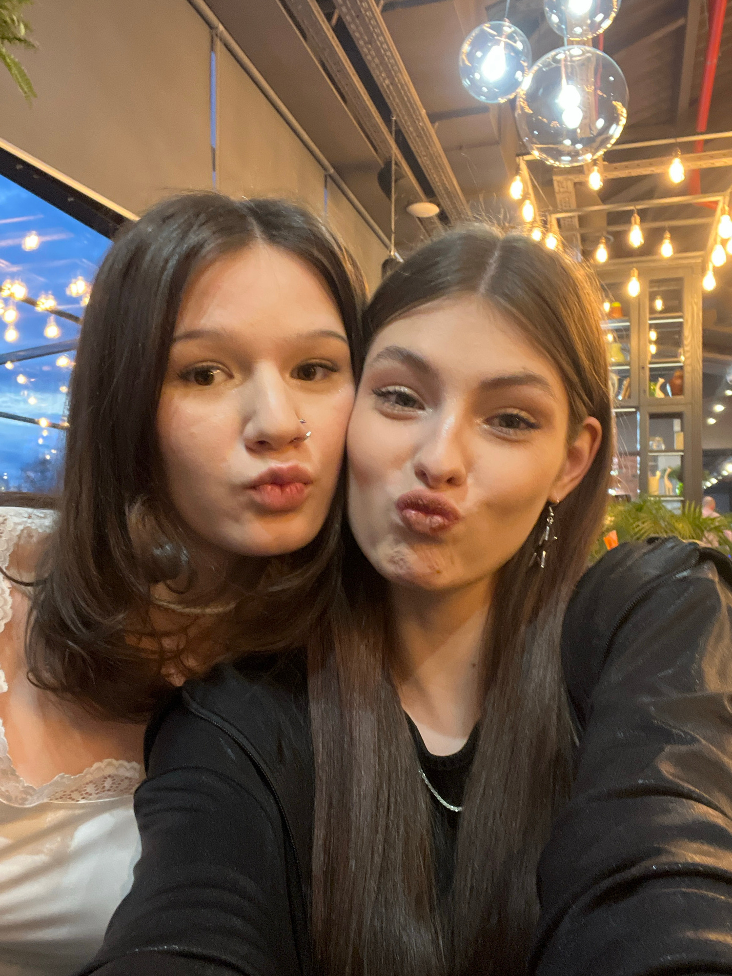 The image is a vertical selfie featuring two young women, taken indoors in what appears to be an evening or nighttime setting. Both women are positioned close together, with one's head resting near th…read more