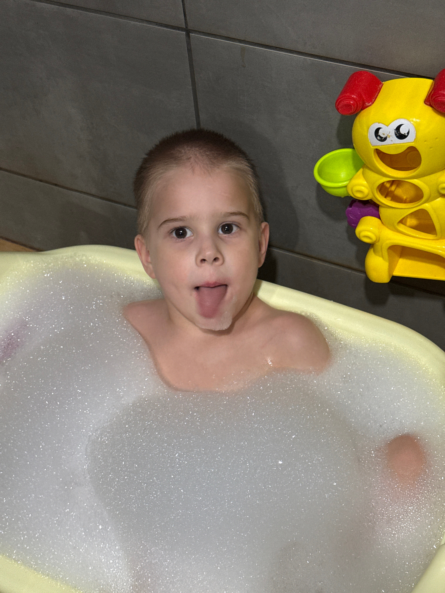 A child is in a bathtub filled with bubbles. The bathtub is light yellow. The child's head and shoulders are visible above the bubbles. The child has short, light brown hair and is looking at the came…read more