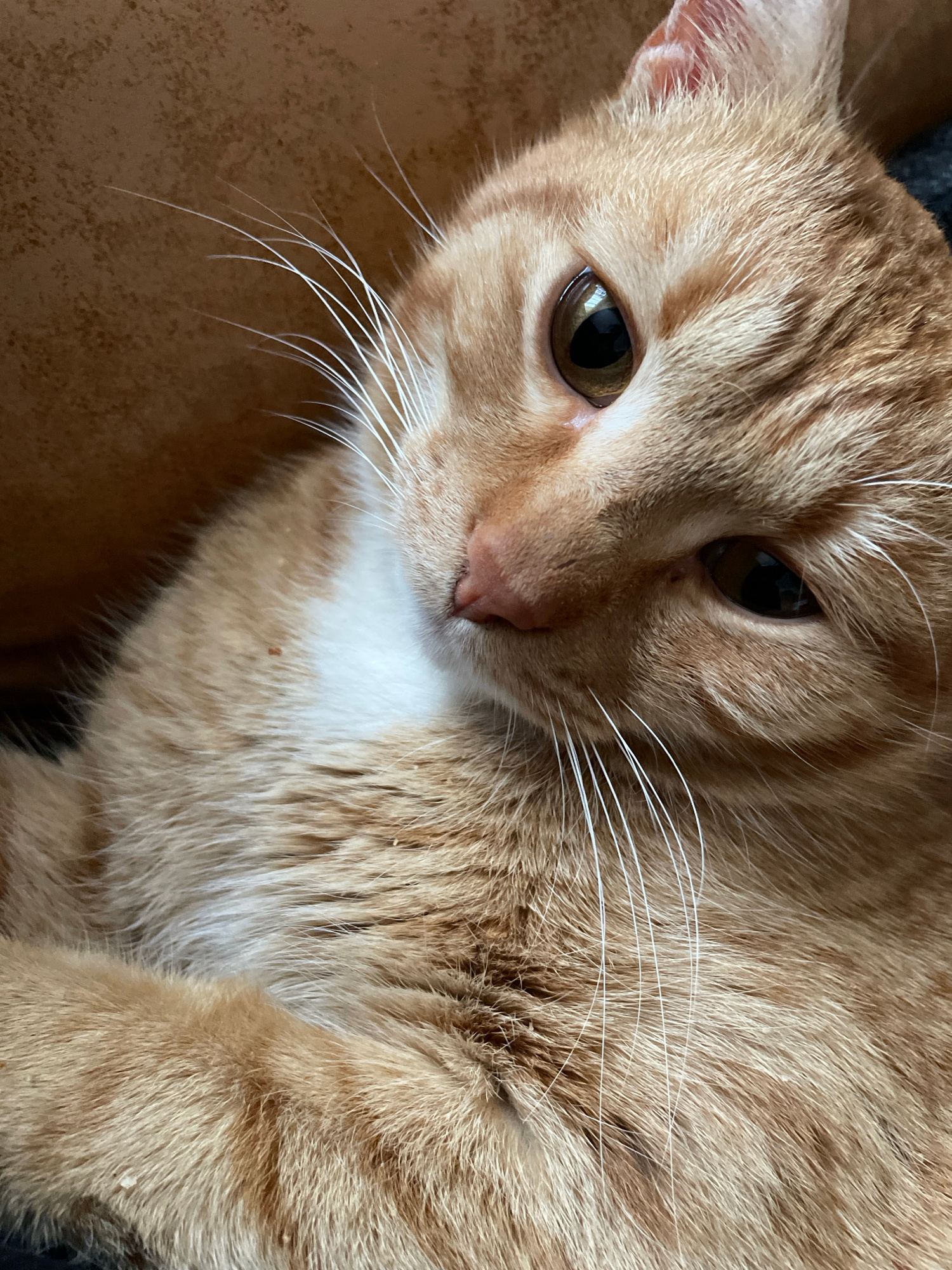 Close-up of an orange tabby cat with white chest fur, laying on a brown surface. The cat has brown eyes, white whiskers, and its fur shows darker stripes. The background is blurry.