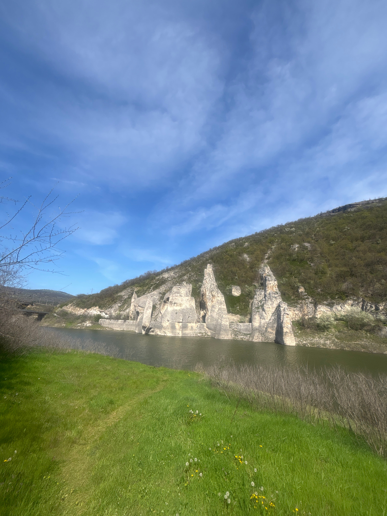 The image displays a scenic natural landscape, likely a river valley or gorge in Asparuhovo, Bulgaria, captured during the day. A clear blue sky with scattered, wispy white clouds occupies the upper…read more