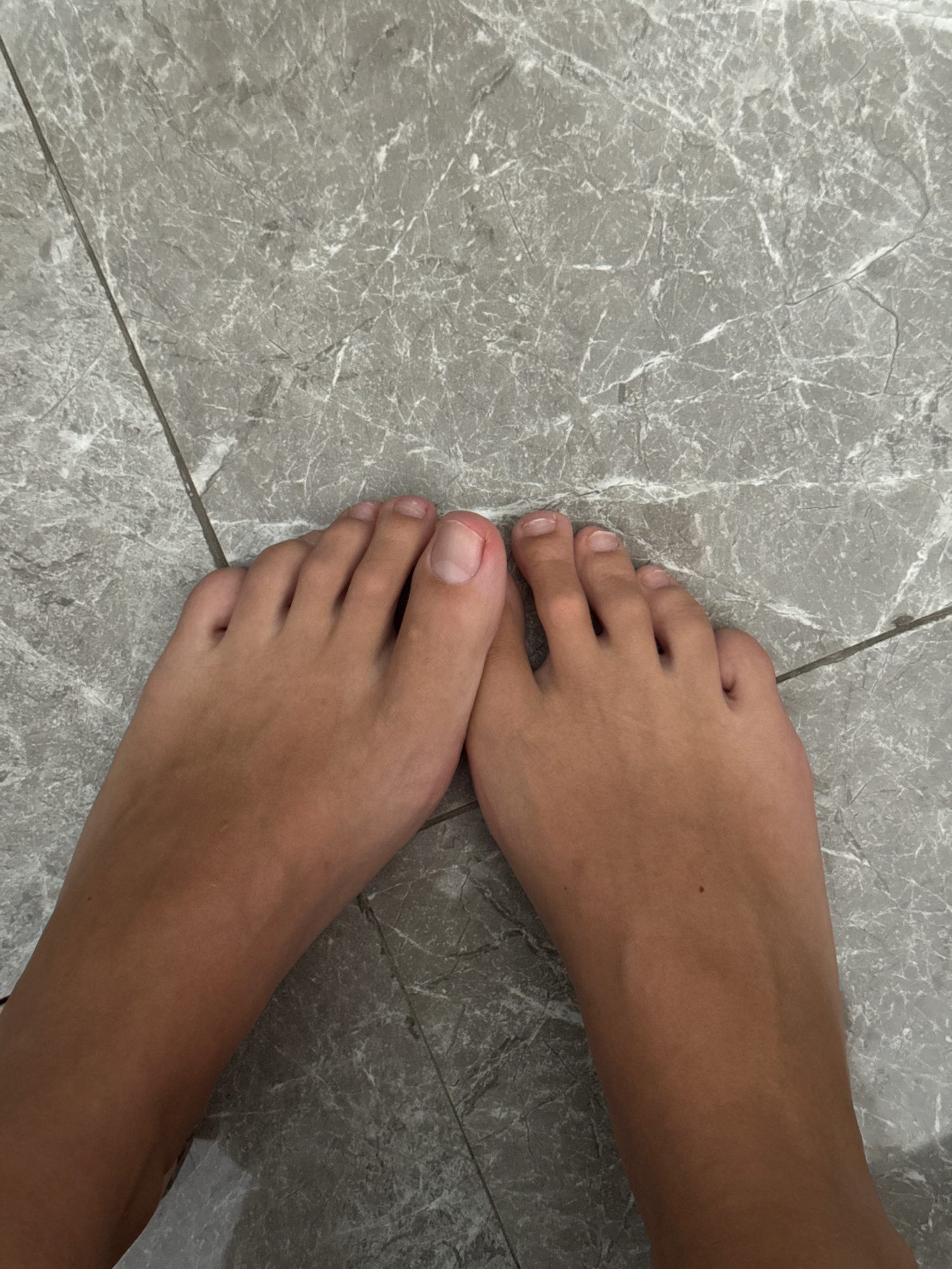 The image shows two bare feet on a grey tiled floor. The feet appear to be those of a young person. The toes are visible and well-formed. The floor tiles have a marbled pattern and are separated by gr…read more