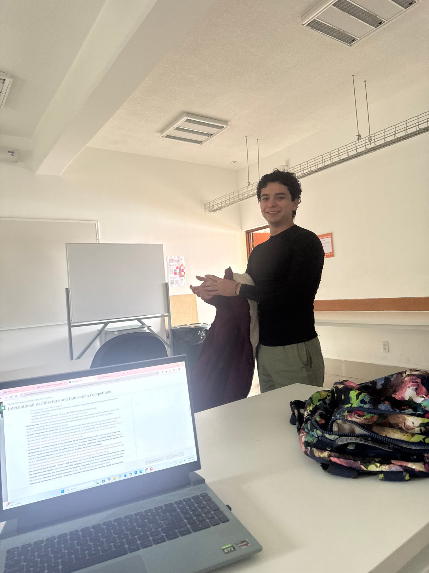 A person is standing in a room in San Andrés Cholula, Mexico. The room contains a white wall, a whiteboard, a chair, a laptop, and a backpack. The person is smiling and looking at the camera. The lapt…read more