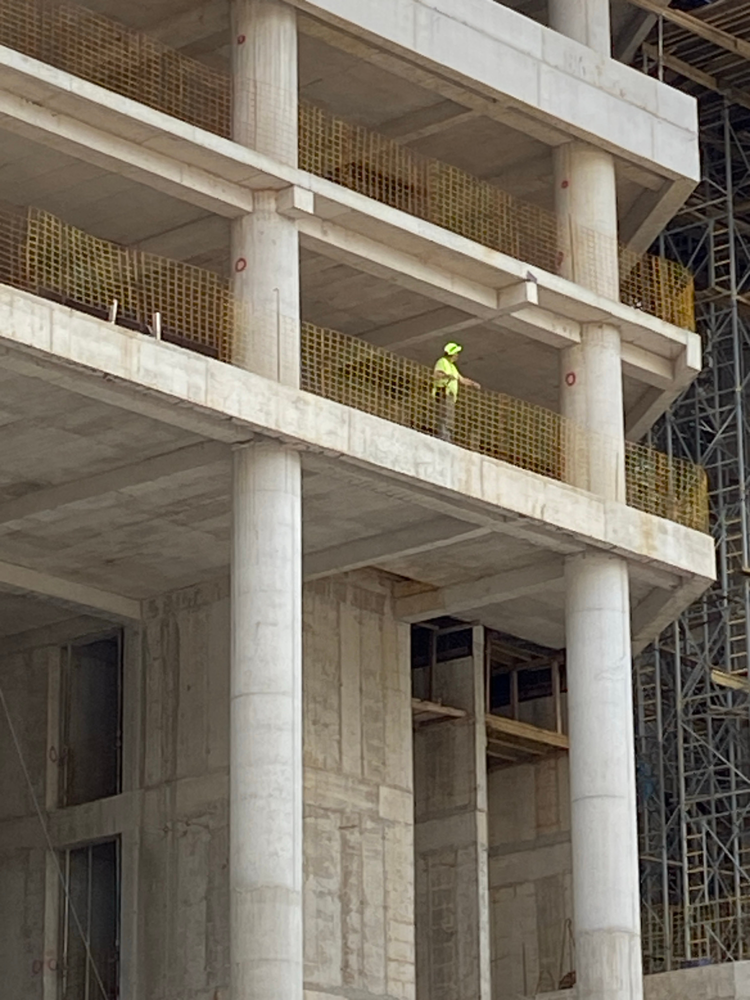 The image depicts the skeleton of a concrete building under construction in Budva, Montenegro. The structure is composed of concrete columns and cylindrical beams. Safety netting is stretched between…read more