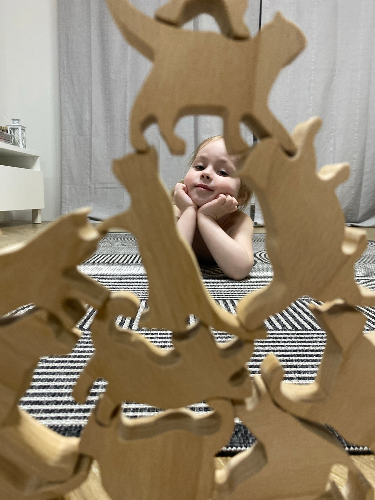 A young child is lying on a black and white striped rug, looking up at the camera through a circular structure made of wooden figures. The child has fair skin and blonde hair, and their hands are supp…read more