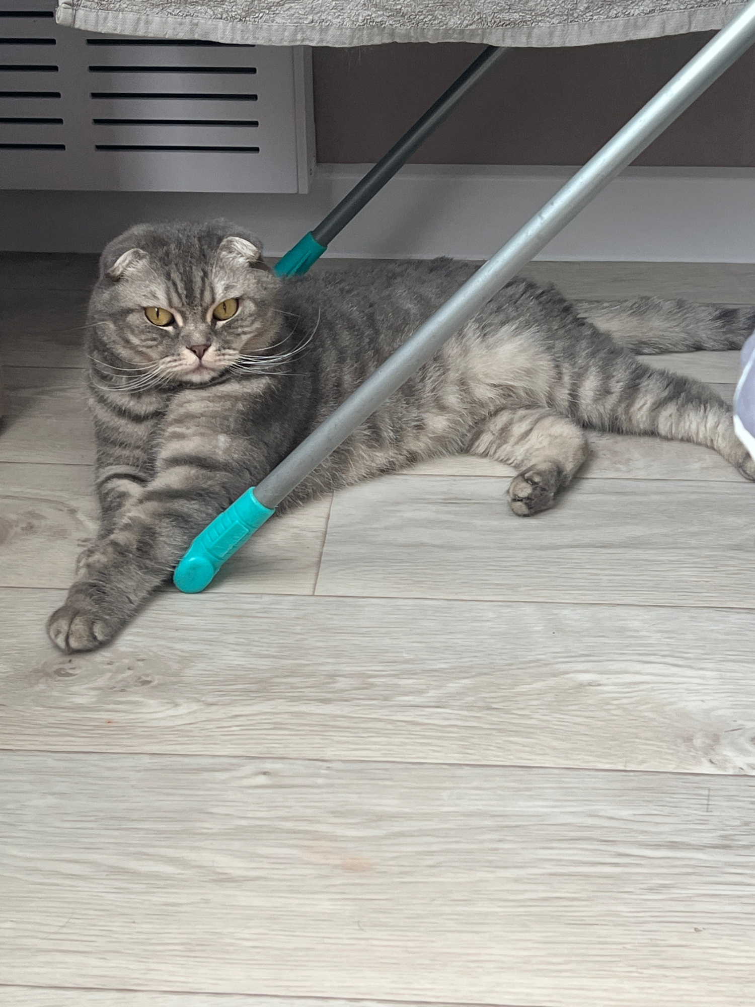 A gray tabby cat with yellow eyes lies on a light-colored wood floor. A metal cleaning tool with a turquoise handle rests on the cat's body. A gray towel hangs on a metal rack next to a white radiator…read more