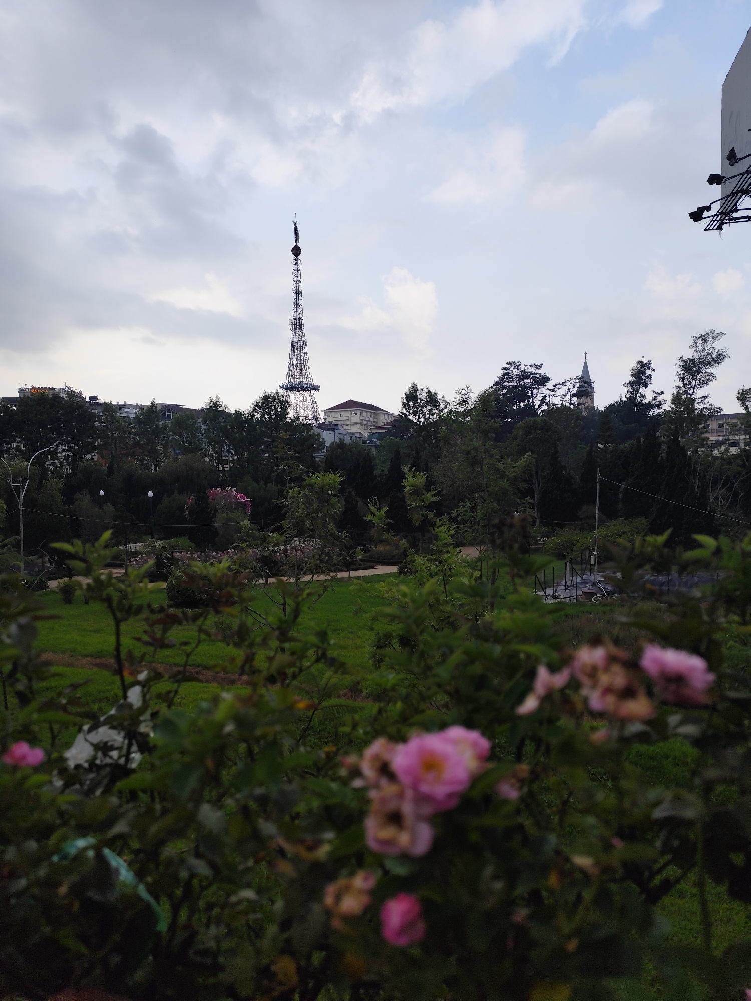 The image shows a park scene in Da Lat, Vietnam. In the foreground, there are pink roses. Beyond the roses, there is a green park area with trees and shrubs. In the background, a tall lattice tower riβ¦read more