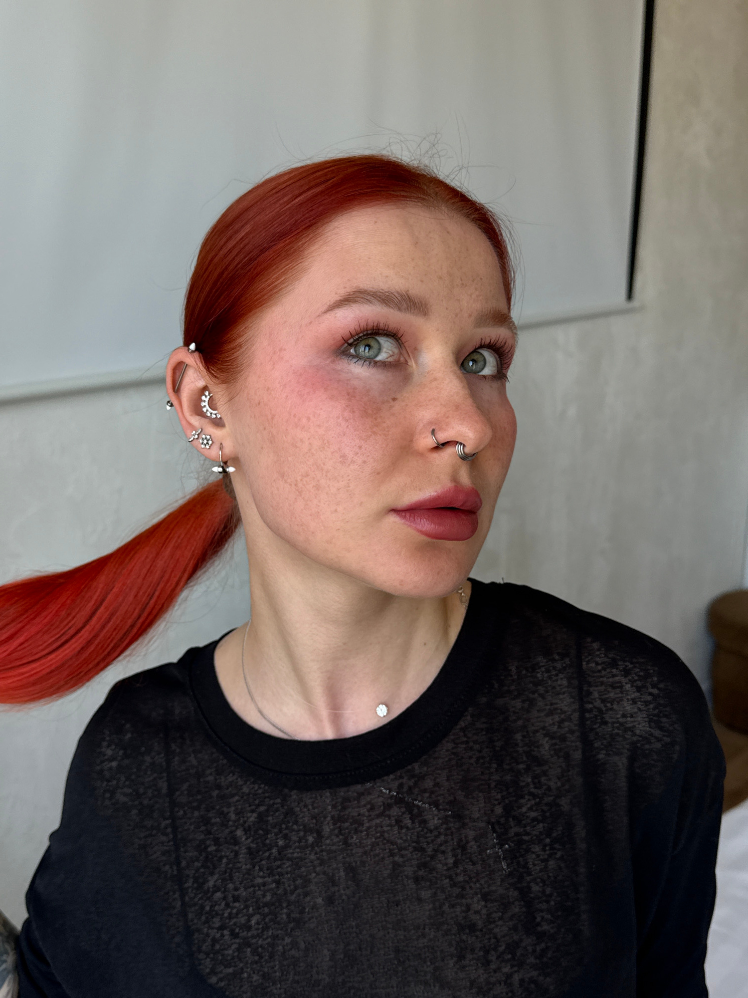 A close-up, rotated portrait shot depicts a woman with red hair and fair skin, heavily freckled on her face. She has light green eyes and pierced nose and ears, wearing multiple earrings and nose ring…read more