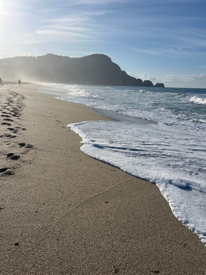 A landscape of a beach where the ocean meets the shore in a foamy embrace. The sand is marked with scattered footprints leading towards a distant figure walking along the shore. A large mountain range…read more