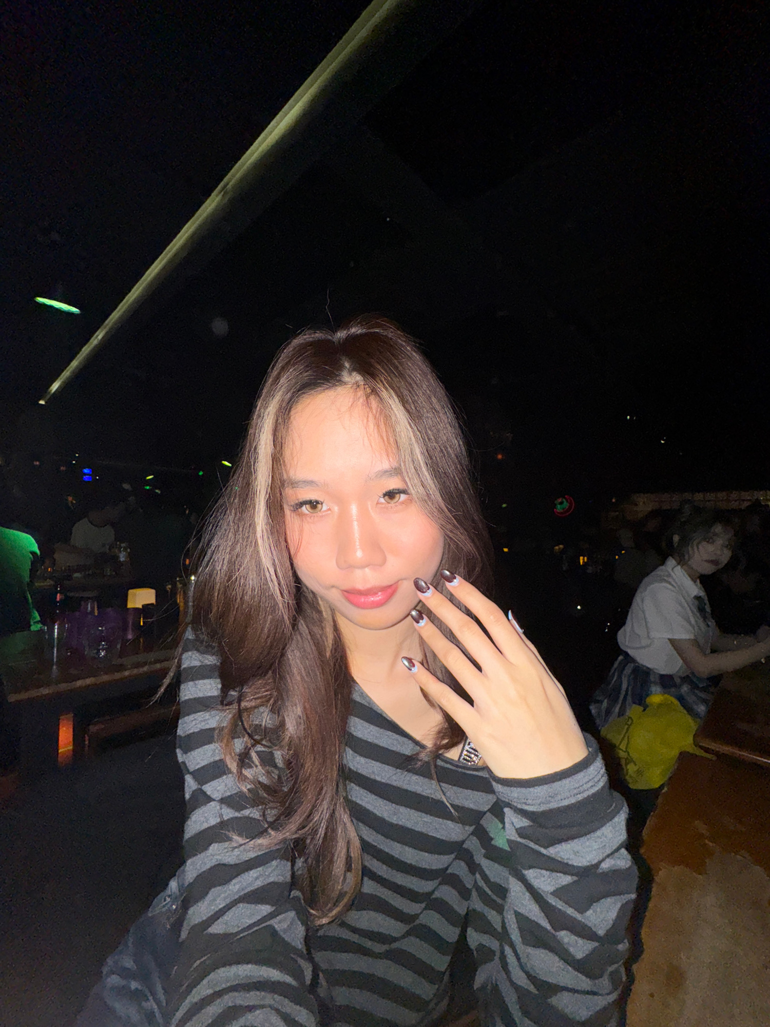 An image taken in a dimly lit indoor establishment, identified as being in Liangjiang, China, depicts a young Asian female in the foreground, facing the camera directly. She has long brown hair with p…read more