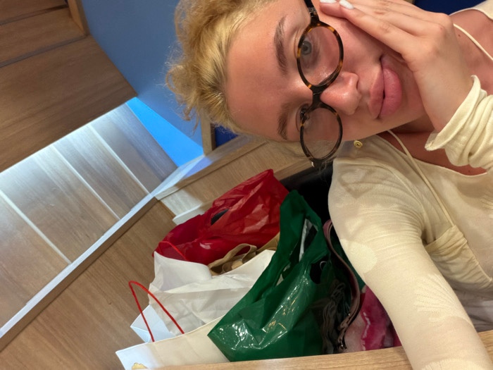 A blonde individual wearing round, tortoiseshell-patterned glasses is depicted in a close-up selfie taken in Wichit, Thailand. Her right hand, with white-painted fingernails, partially covers her left…read more