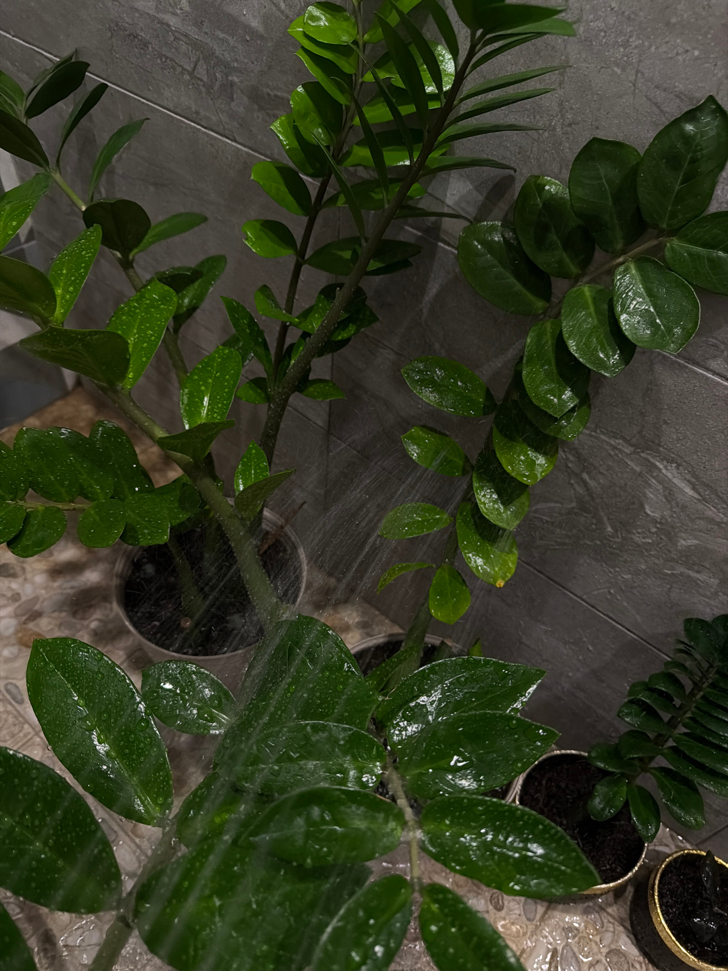 A high-angle shot captures several potted ZZ plants being watered indoors. The plants feature dark green, shiny leaves covered in water droplets. The pots appear to be a mix of plastic and decorative…read more