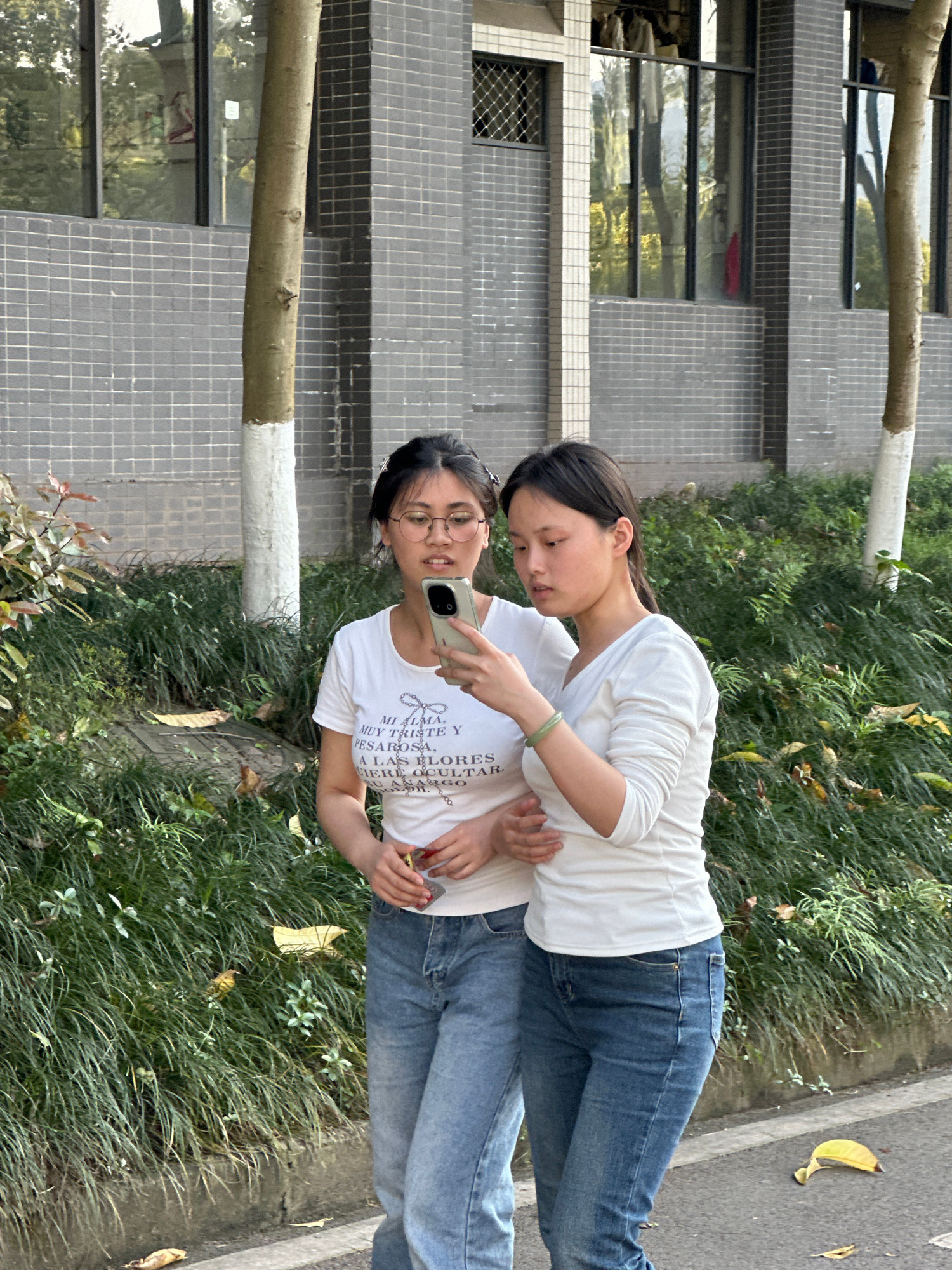 Two women are standing in front of a building in Jiangjin, China, possibly taking a photo. The taller woman is wearing a long-sleeved white shirt and blue jeans, standing behind the shorter woman. The…read more
