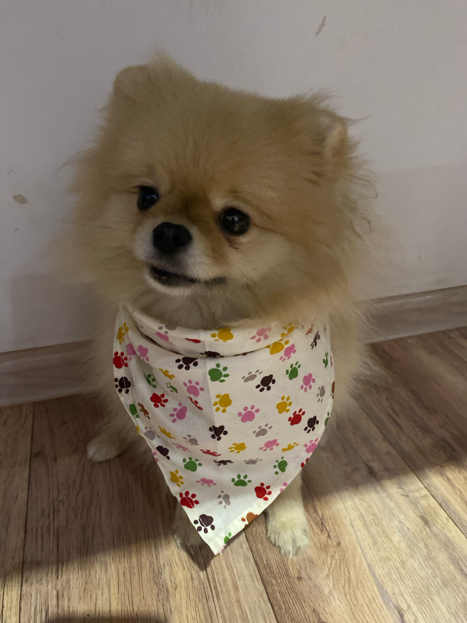 A tan, fluffy dog wearing a bandana patterned with colorful paw prints sits on a wooden floor. The dog faces the camera. Behind the dog is a white wall. The location is unknown.
