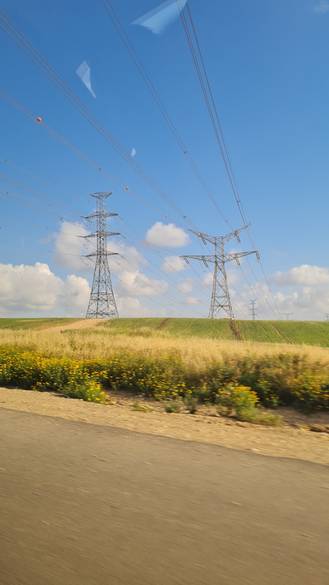 The image shows a view of power lines and a field of yellow flowers next to a road, likely taken from a moving vehicle. The sky is blue with scattered clouds. The power lines run parallel to the road…read more