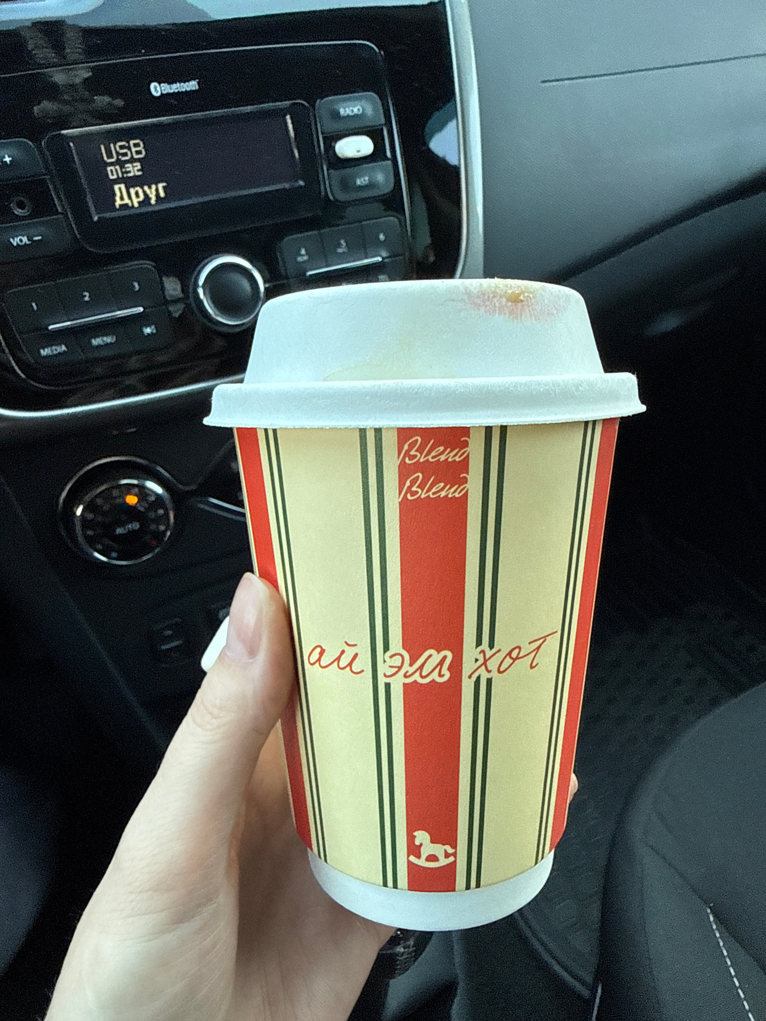 A tan and red striped disposable coffee cup with a white lid rests in a person's hand inside of a car. There is a light pink mark on the lid. The car's radio panel displays "USB 01:32 Друг" and the wo…read more