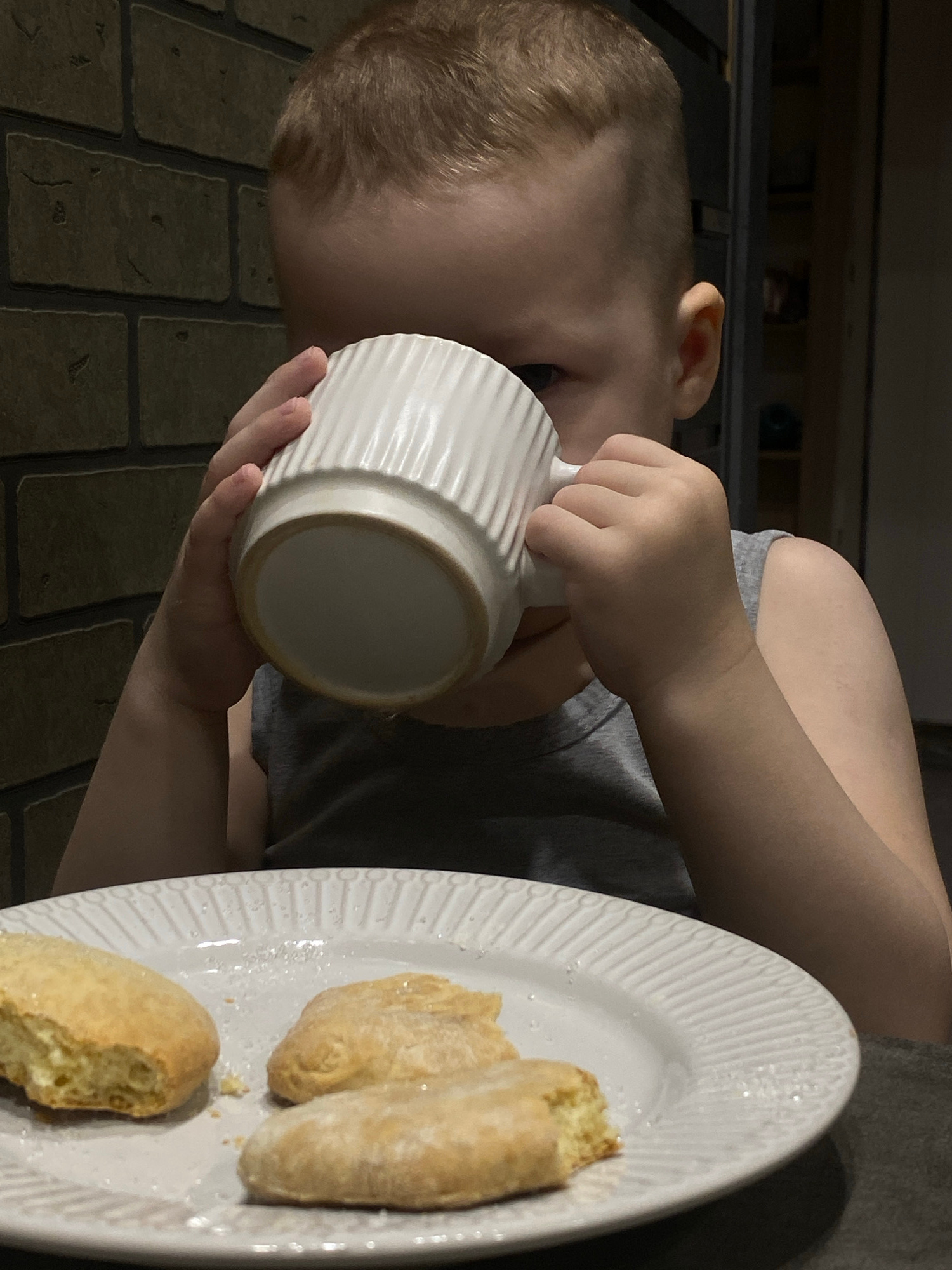 A young child with light blonde hair is drinking from a white mug. The child is wearing a gray shirt. To the right of the child is a white plate with three pieces of bread on it. The background consis…read more