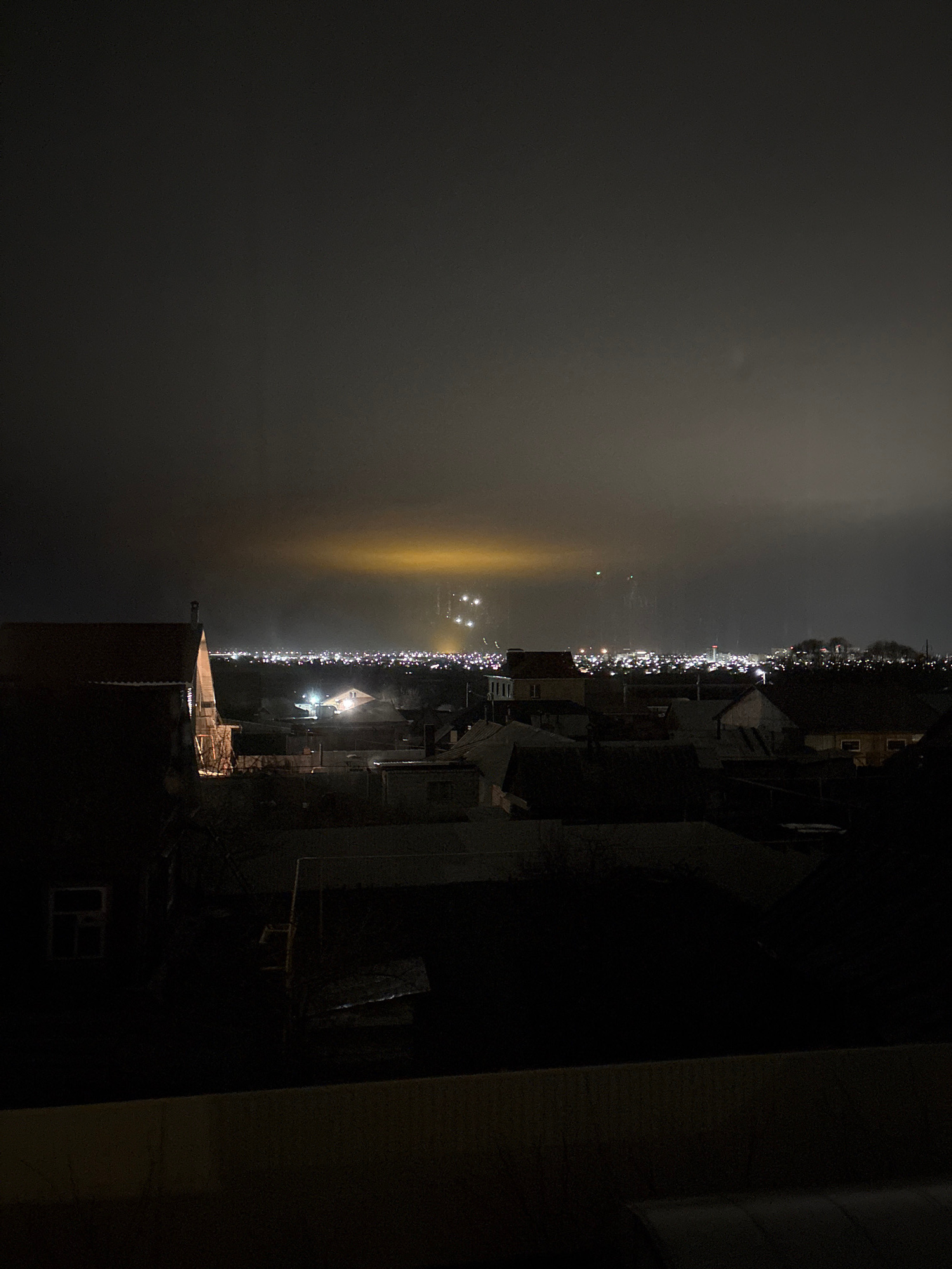 The image depicts a night scene of Ulyanovsk, Russia, taken from an elevated position. The view includes a river or large body of water on the left side of the image, obscured by heavy fog, and the il…read more
