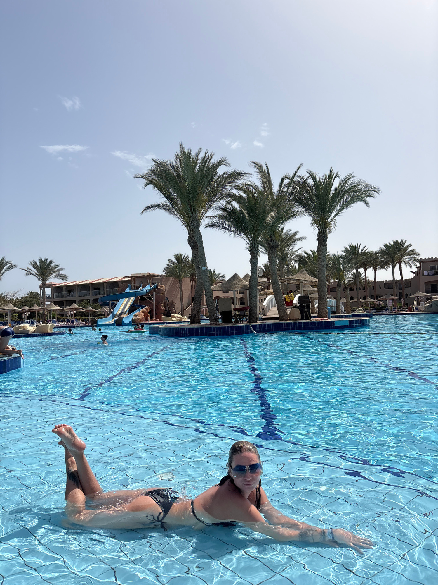 A young woman in a black bikini and sunglasses stands waist-deep in a swimming pool. Palm trees line the pool edge, and a building is visible in the background. The scene is set in Unknown, Egypt.