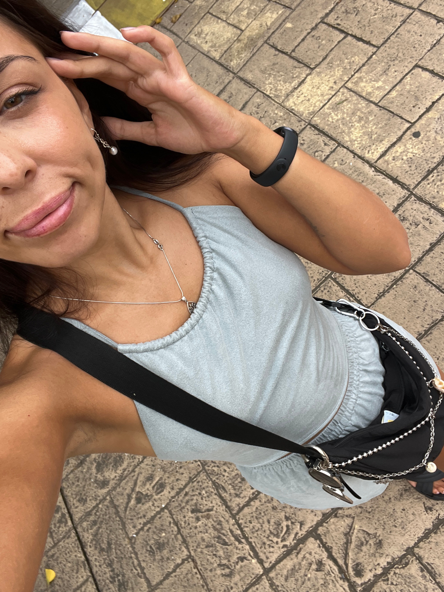 A high-angle selfie captures a woman lying or leaning on patterned grey-brown paved ground. The woman, appearing to be an adult with dark hair, looks up towards the camera with a relaxed and slightly…read more