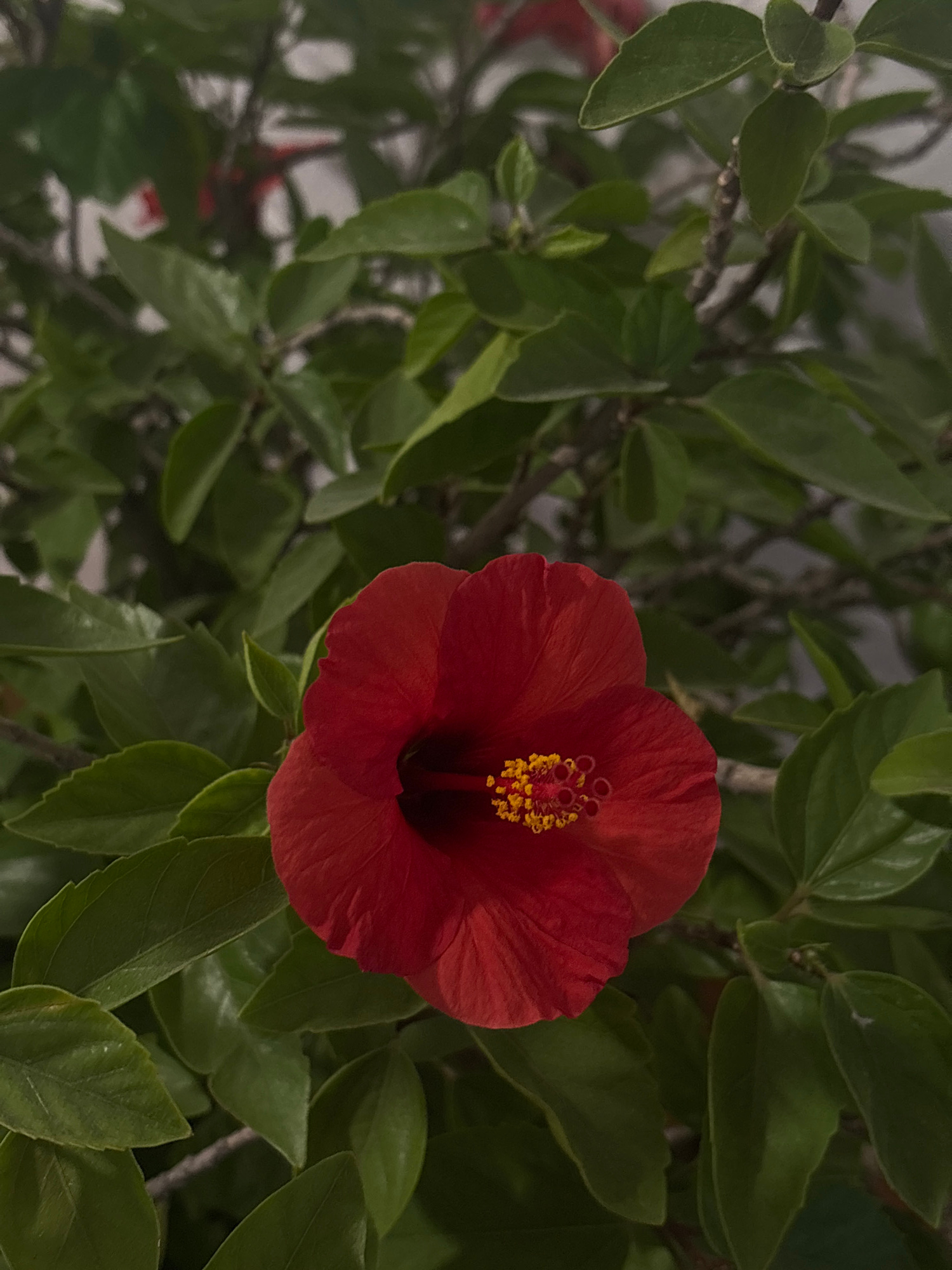 The image shows a red hibiscus flower in bloom. The flower is centrally located in the frame, surrounded by green leaves. The background is filled with more leaves and branches. There is no specific i…read more