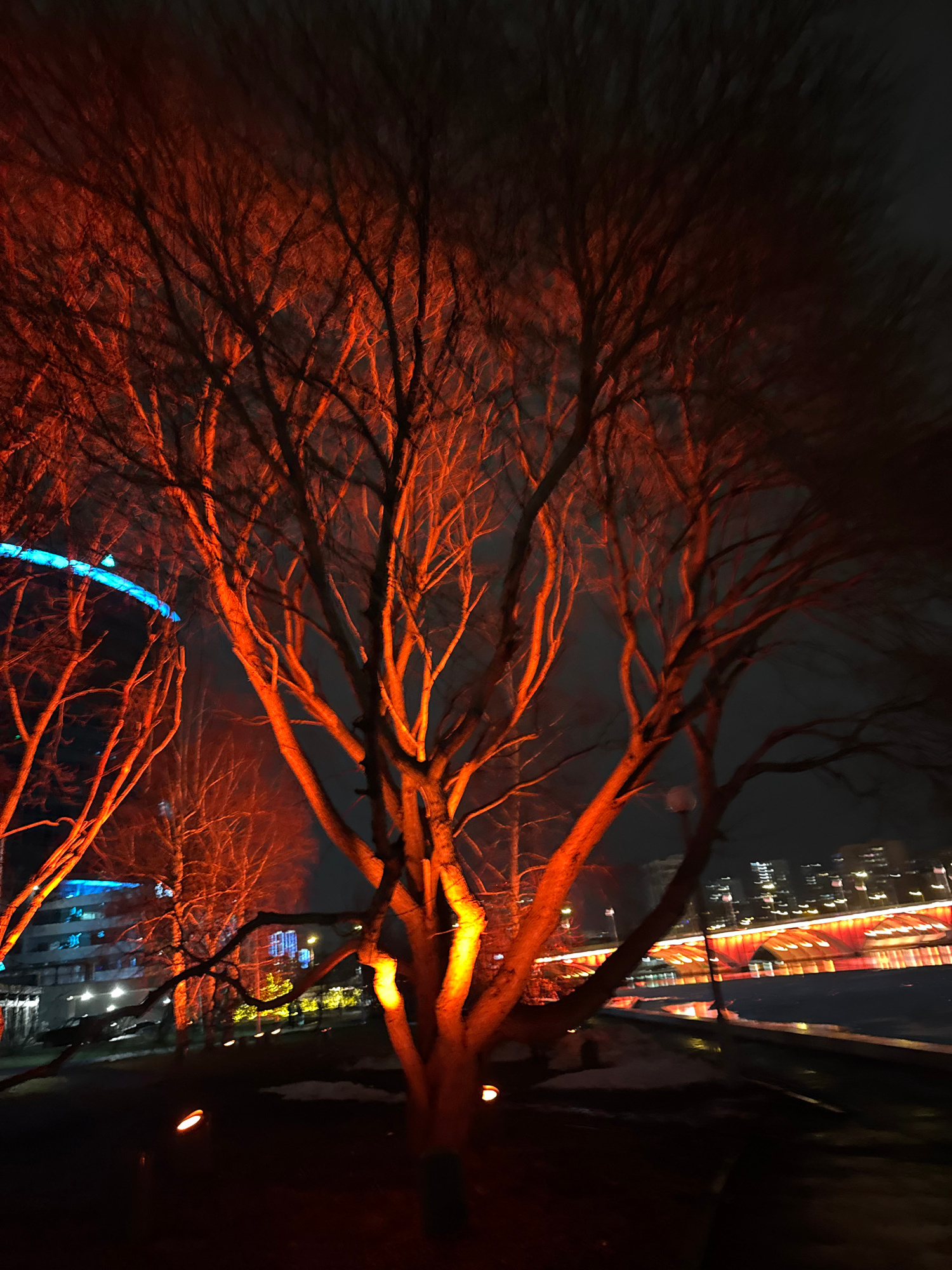 The image is an outdoor nighttime scene in Yekaterinburg, Russia. A bare tree with branches lit by orange light dominates the foreground. In the background, the city skyline is visible with buildings…read more
