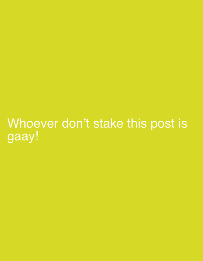 A yellow background displays the text "Whoever don't stake this post is gaay!" in white font.
