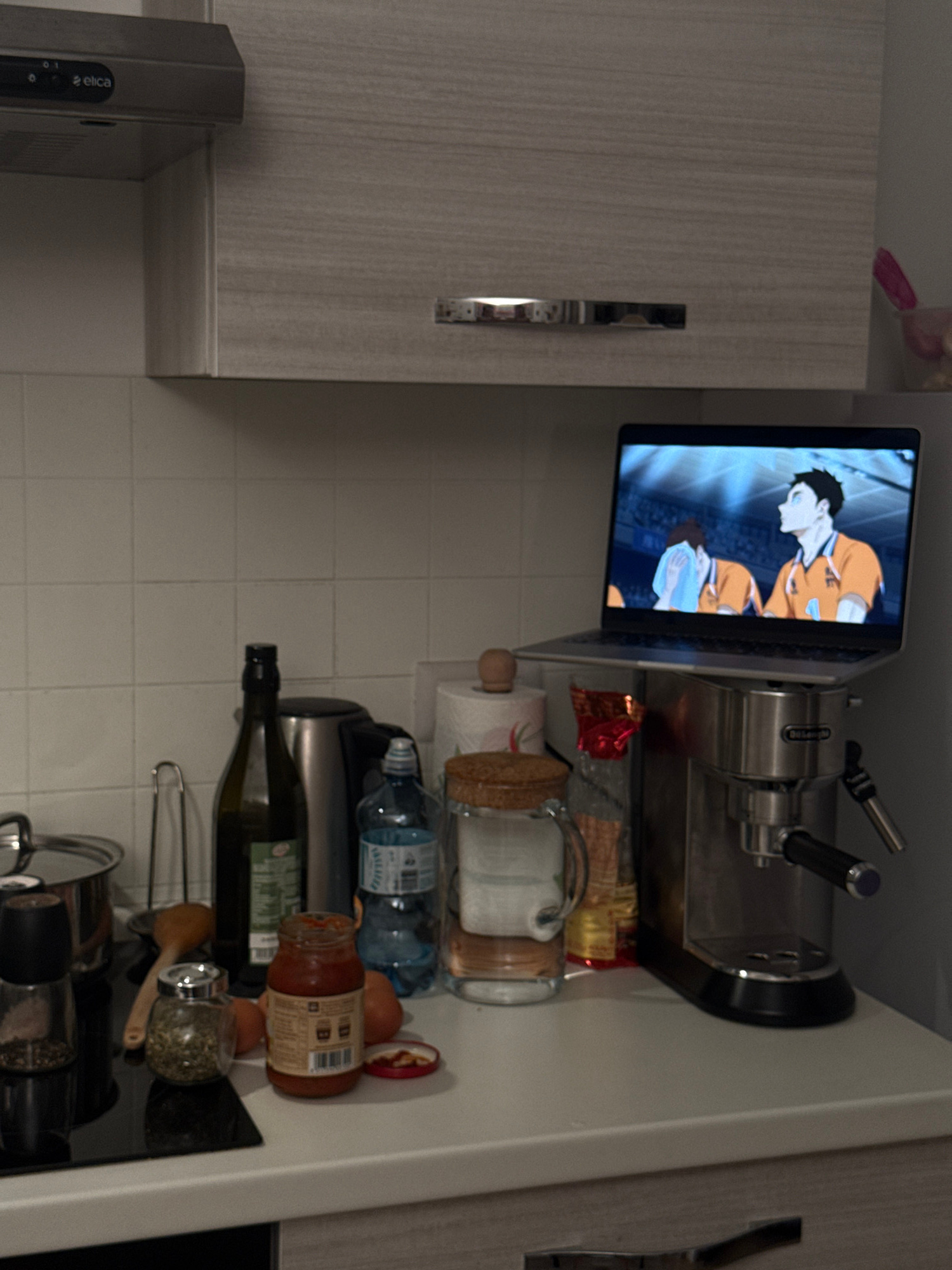 The image displays a kitchen counter area, rotated 90 degrees clockwise, revealing a functional and lived-in space. On the left side of the upright image (top-left in the provided orientation), part…read more