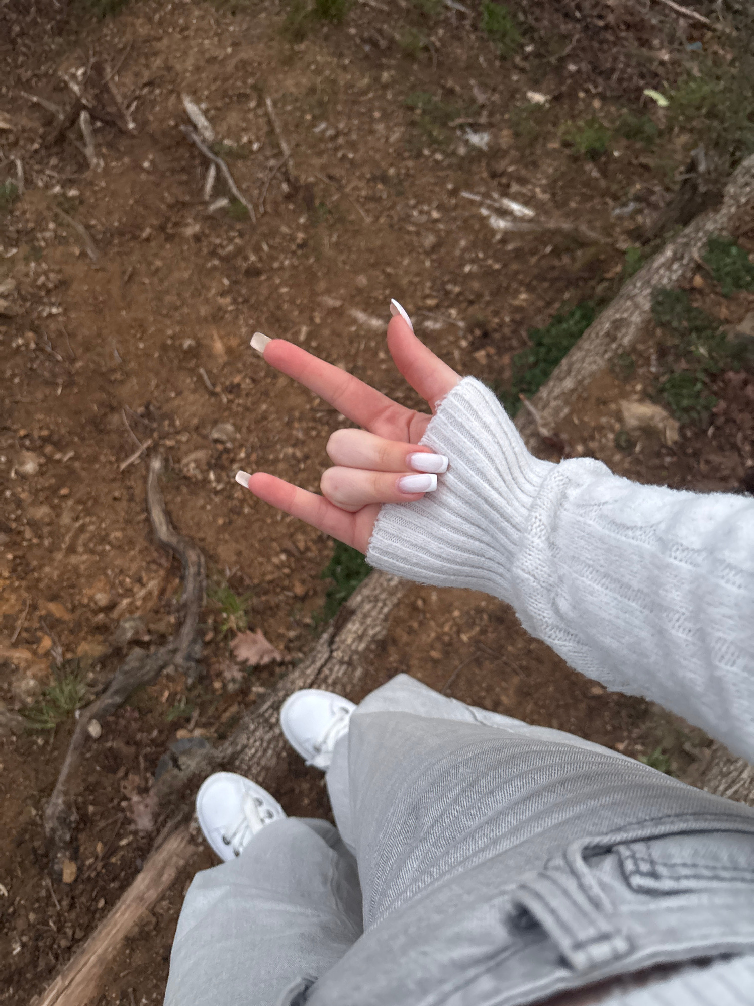 A person stands on brown earth near a fallen log. They wear a white sweater with ribbed cuffs, loose grey trousers, and white sneakers. The person's hand is extended with fingers arranged in the "rock…read more