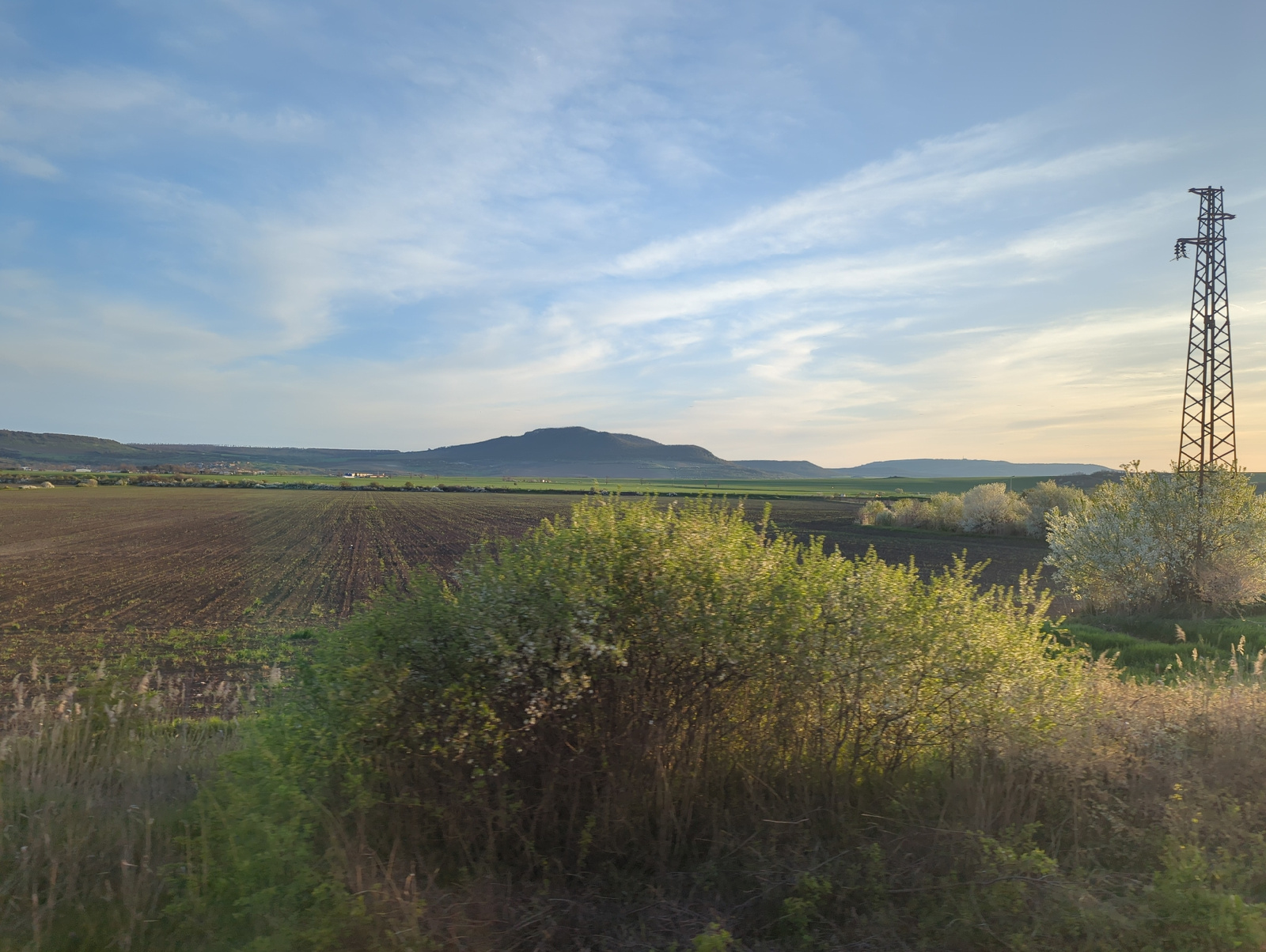 The image depicts a rural landscape in Jitnitsa, Bulgaria. A cultivated field occupies a significant portion of the scene. In the distance, a hill or mountain range is visible. In the foreground, bush…read more
