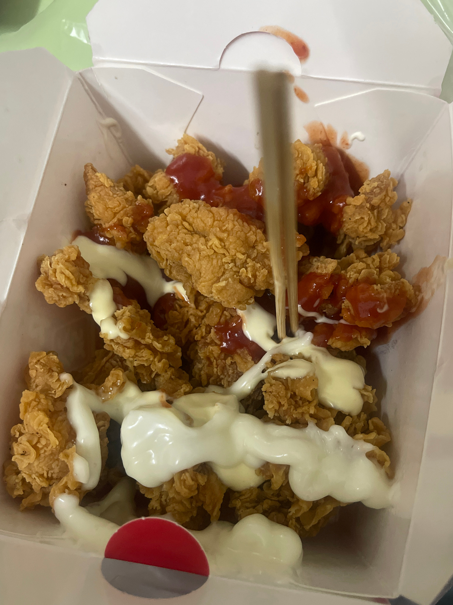 The image shows a white take-out box filled with fried chicken pieces covered in red and white sauces, being picked up by wooden chopsticks. The location is Chongqing High-tech Zone, China. No people…read more
