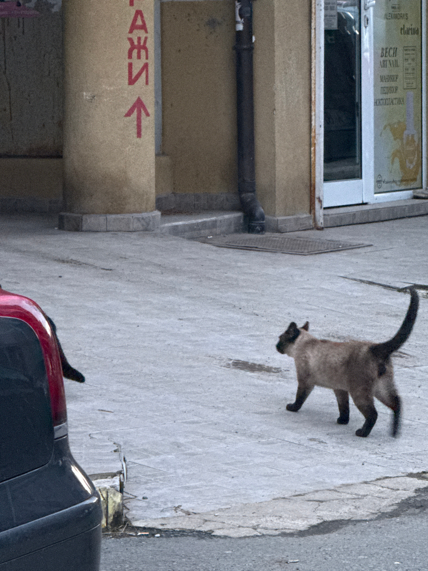 An outdoor shot shows a Siamese cat walking on a sidewalk next to a car on a street in Burgas, Bulgaria. The cat has dark brown fur on its face, tail, and paws with a tan body. A red car is parked on…read more