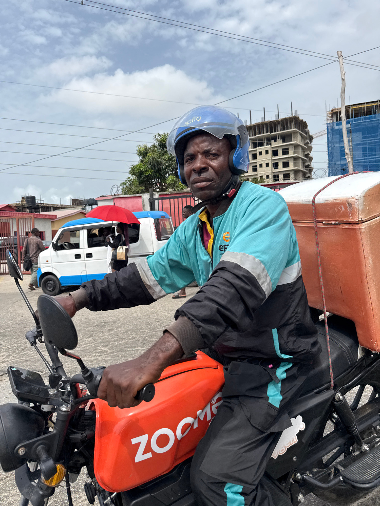 A medium shot captures a motorcycle rider in Itirin, Nigeria. The rider, wearing a light blue helmet, a turquoise and black jacket, and displaying visible signs of fatigue or weariness, is seen seatedβ¦read more
