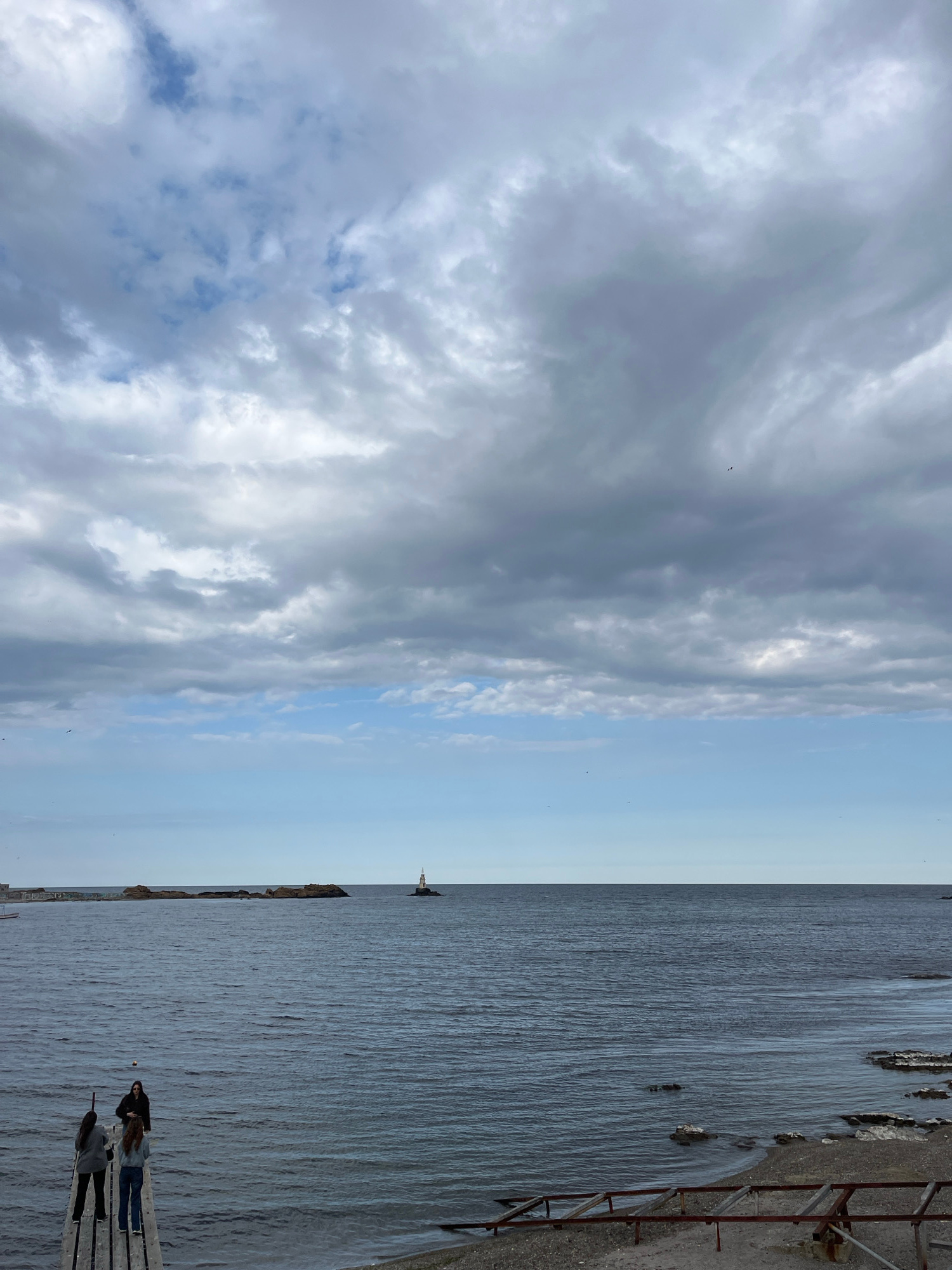 The image depicts a coastal scene in Ahtopol, Bulgaria. To the left is a sky filled with a mix of light blue and dark grey clouds. To the right is the Black Sea, with calm waters. A stone pier is visi…read more