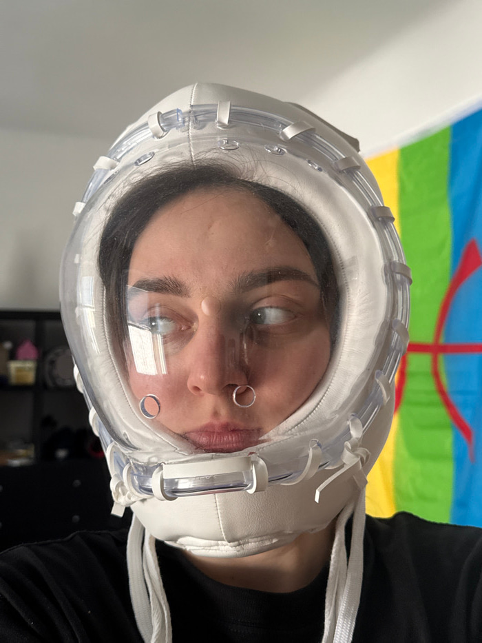 The scene is an indoor environment located in Hainburg an der Donau, Austria. A female subject is depicted from the upper torso, facing generally forward with her head slightly angled to her right, di…read more