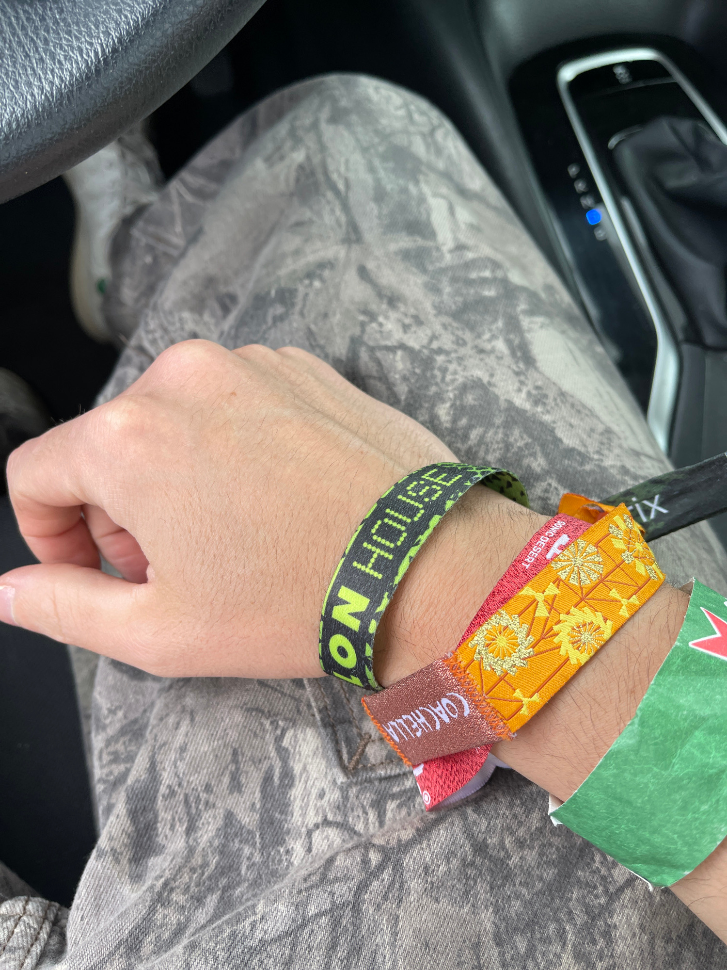 A close-up shot depicts a person's hand and wrist adorned with multiple wristbands, including ones for Coachella and Sonic Desert, while in a vehicle. The background shows the vehicle's interior, incl…read more