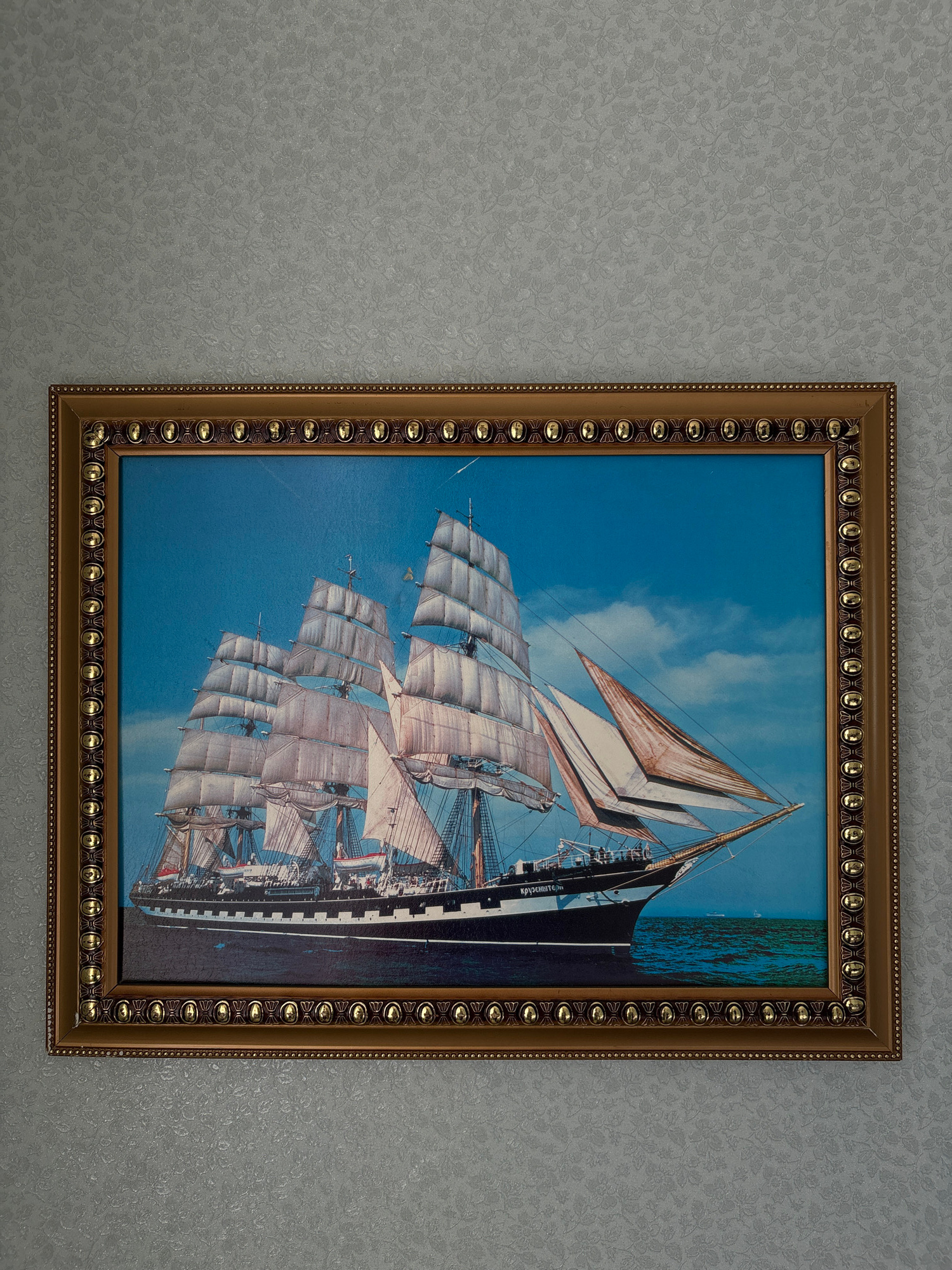 A framed picture hangs on a wall with patterned wallpaper. The picture depicts a sailing ship at sea under a partly cloudy blue sky. The ship has many sails and masts. On the side of the ship is writt…read more