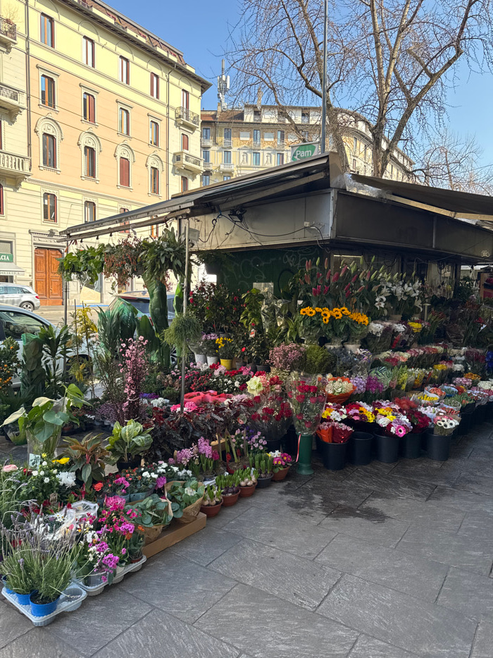 The image depicts a vibrant street scene in Milan, Italy, specifically featuring a flower stall on a wide pavement. The primary subject is a semi-permanent flower stall, characterized by a dark, flat…read more