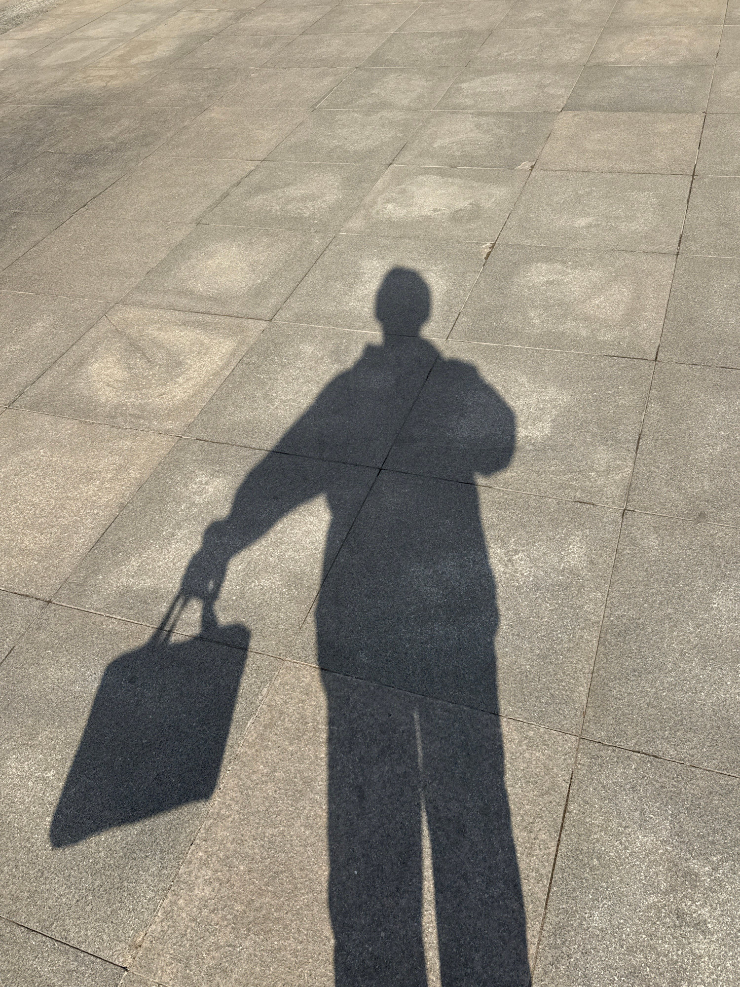 A shadow of a person pulling a wheeled suitcase is cast on a paved walkway or plaza. The paving consists of large, light gray, rectangular stones. The scene is located in Zhongtun, China.