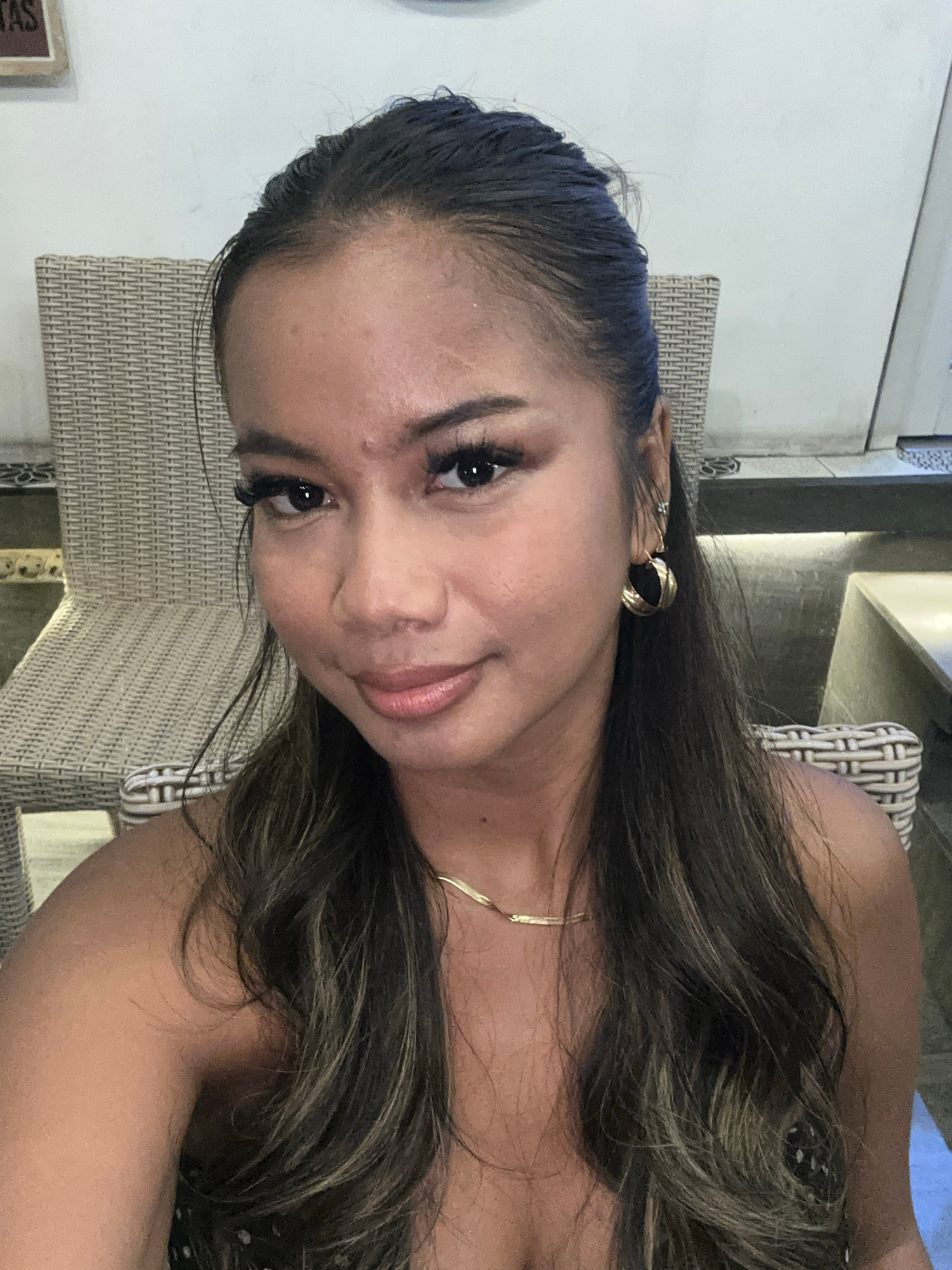 A woman is photographed indoors, possibly in Singapadu, Indonesia. She has long dark hair with blonde highlights, gold hoop earrings, and a gold necklace. She is sitting on a woven chair. The backgrou…read more