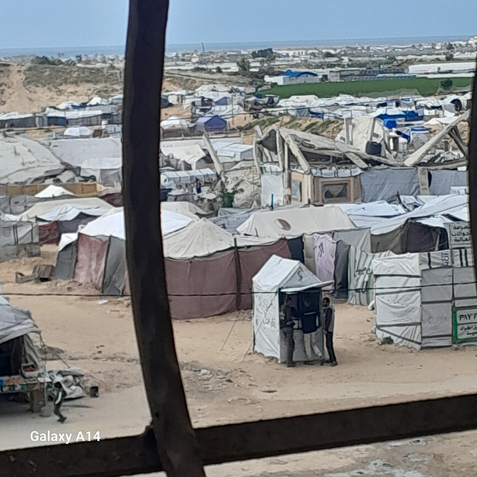 The image, taken from an elevated perspective through a window frame, depicts a dense settlement likely within Khan Yunis, Palestinian Territory. The settlement is comprised of numerous closely packed…read more