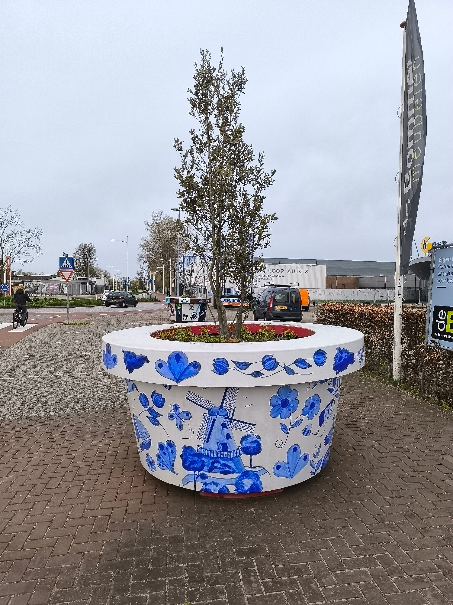 A large, decorative flower pot, painted in a Delftware style with blue windmills and floral motifs, stands on a brick-paved area in Alkmaar, Netherlands. A slender tree with sparse foliage grows from…read more