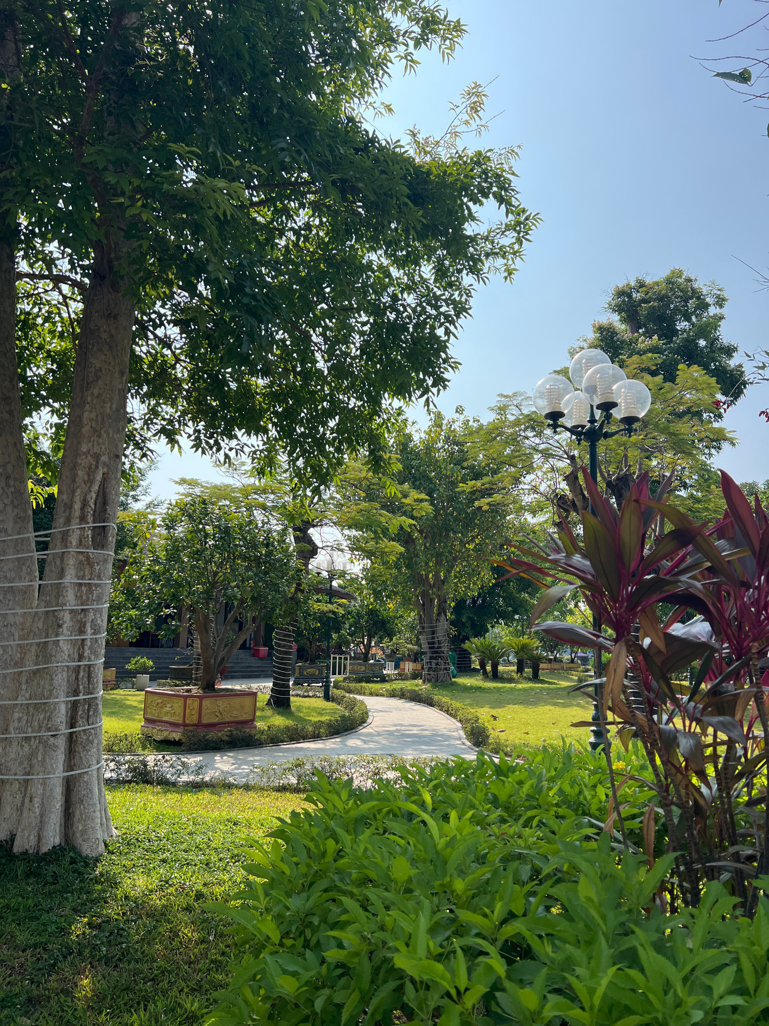 The image displays a serene park or garden, characterized by lush greenery under a clear blue sky. A light-colored, winding path curves through the scene, bordered by well-maintained green grass. Nume…read more
